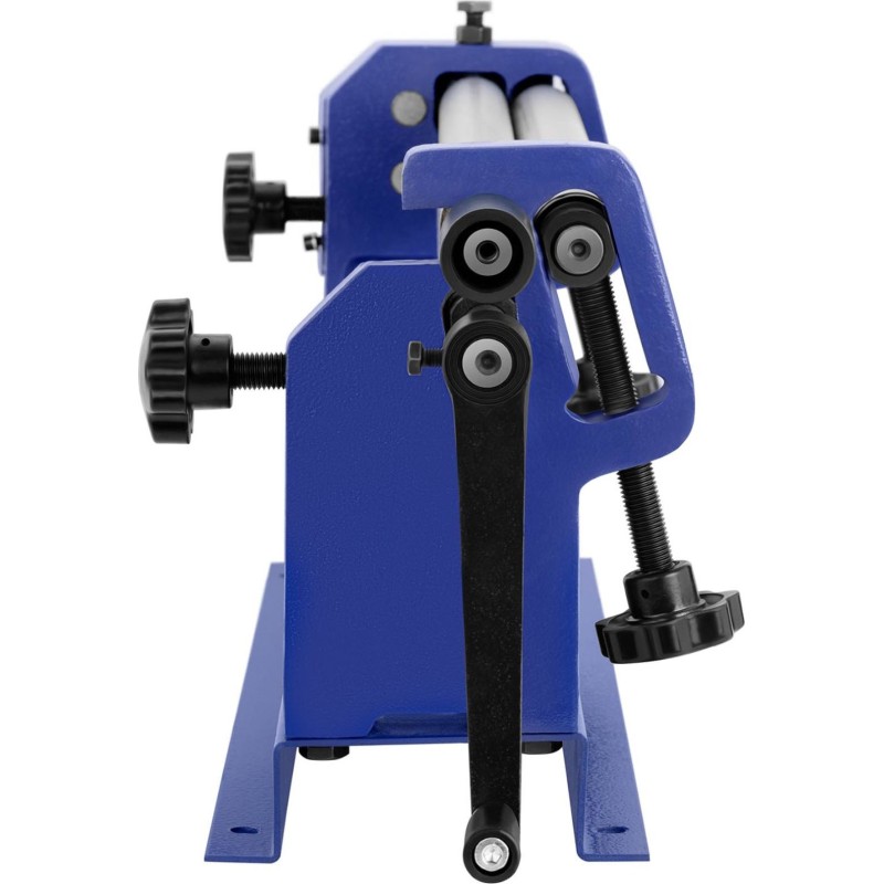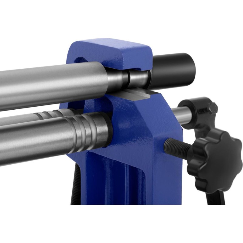 Das Gerät verfügt über drei Metallrollen, mit denen sich Bleche biegen, zu Kegeln oder Zylindern formen lassen. Mithilfe der Rillen kann Draht zu Bögen oder Kreisen gewickelt werden. Die Walzen sind für die Bearbeitung von Material mit einer maximalen Breite von 610 mm und einer Dicke von 0,8 mm ausgelegt. Eine Handkurbel ermöglicht das Drehen der Walze beim Einlegen des Blechbogens in die Walzmaschine. Ein rutschfester Gummigriff sorgt für komfortables Arbeiten. Mit den Einstellrädern lässt sich der Abstand zwischen den Walzen an die Materialstärke anpassen. Die obere Walze ermöglicht das schnelle Entnehmen des fertigen Elements und erleichtert die Wartung. Das Gerät kann dank der Bohrungen im Sockel am Untergrund befestigt werden. Bei Weichstahl ist Flachwalzen möglich, wodurch ein abgeflachtes Blech oder ein Blech mit geringfügig reduzierter Dicke entsteht. Die Walzmaschine eignet sich auch zur Herstellung von Bögen mit konstantem Radius und Zylindern. Die maximale Materialstärke beträgt 0,8 mm. Dank der Rillen an den Walzen kann die Blechwalzmaschine auch Stangen, Draht oder kleine Rohre mit einem Durchmesser von 2,4; 3,2 und 4 mm formen.