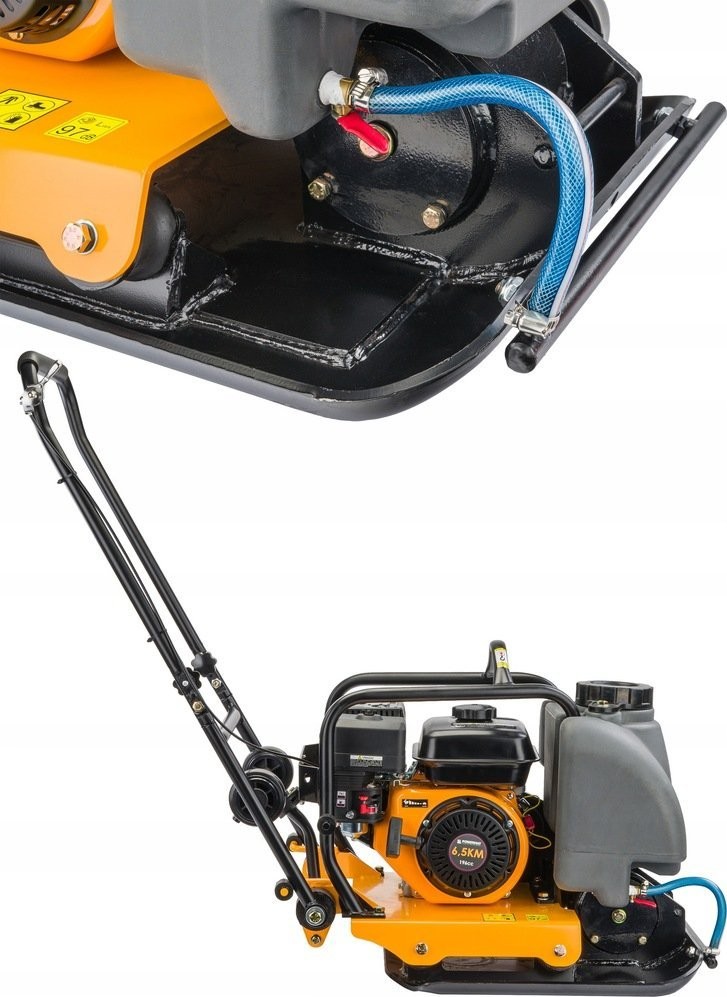 Der Wassertank mit Hahn ermöglicht eine zusätzliche Beschwerung der Verdichterplatte bei gleichzeitiger Bewässerung über ein Metallrohr mit Öffnungen.