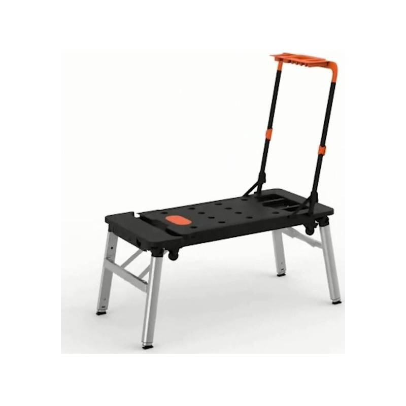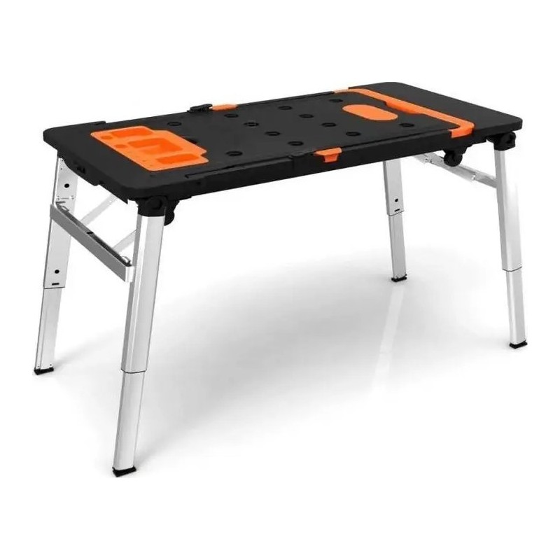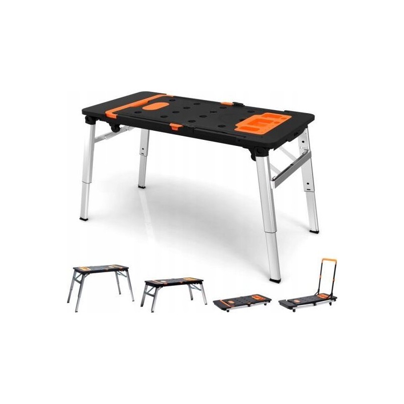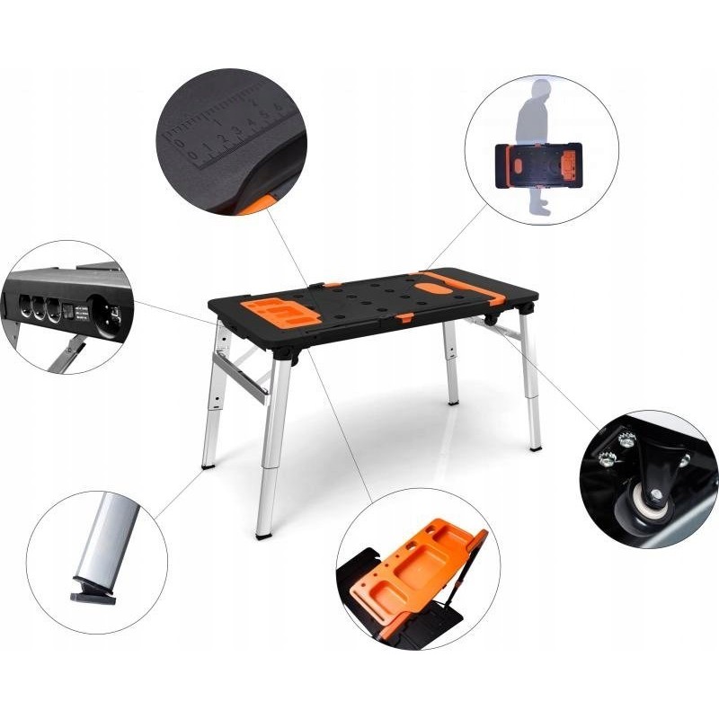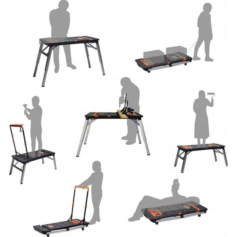 Er verfügt über eine riesige Arbeitsfläche, dank der das Sägen und Schrauben kinderleicht ist. An der Seite befindet sich eine eingebaute Steckdose. Er kann als stabiles Gerüst oder als Arbeitsplattform verwendet werden. Im Lieferumfang sind Rollen enthalten, mit denen sich der Tisch in einen Rollwagen verwandeln lässt. Er ist außerdem mit einer Werkbank-Liegefläche ausgestattet, was in Autowerkstätten, Kfz-Servicebetrieben und für Heimwerker nützlich ist. Er lässt sich zu einer handlichen Kofferform zusammenklappen, die sich leicht verstauen und transportieren lässt.
