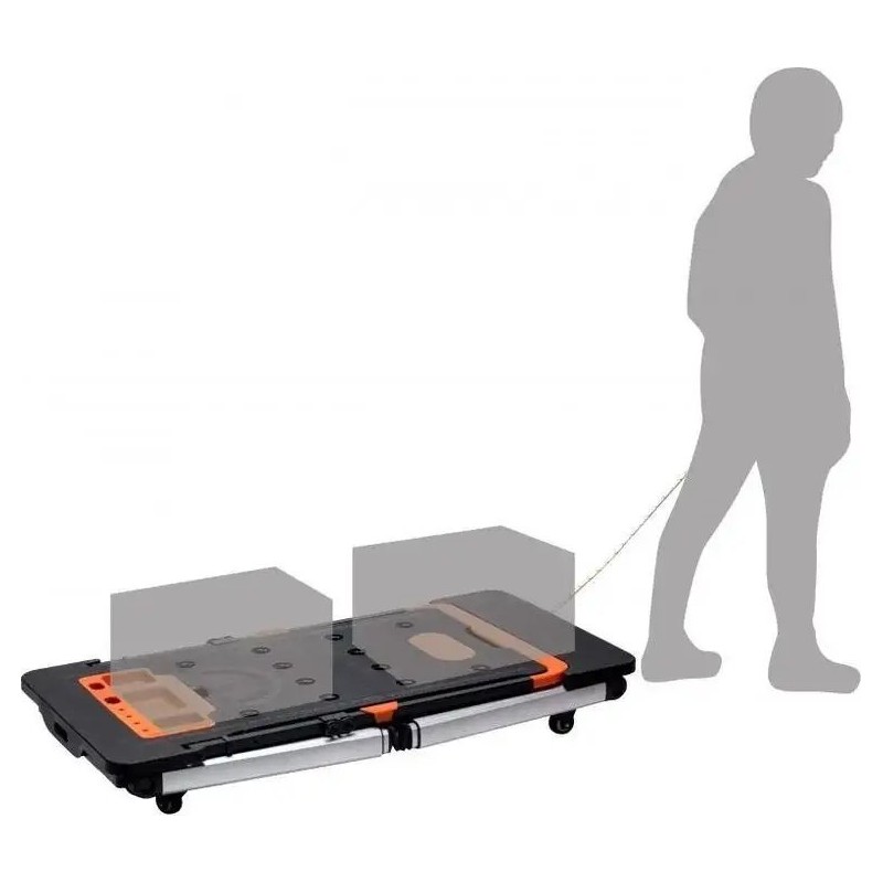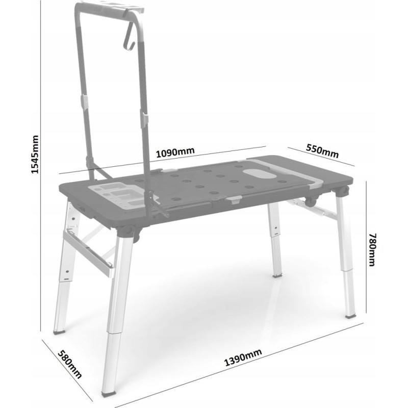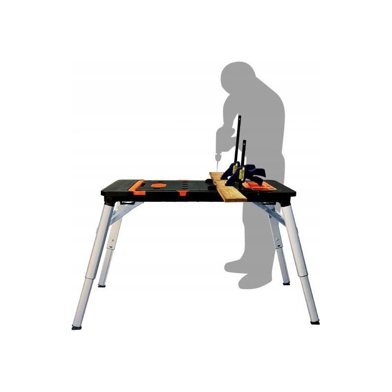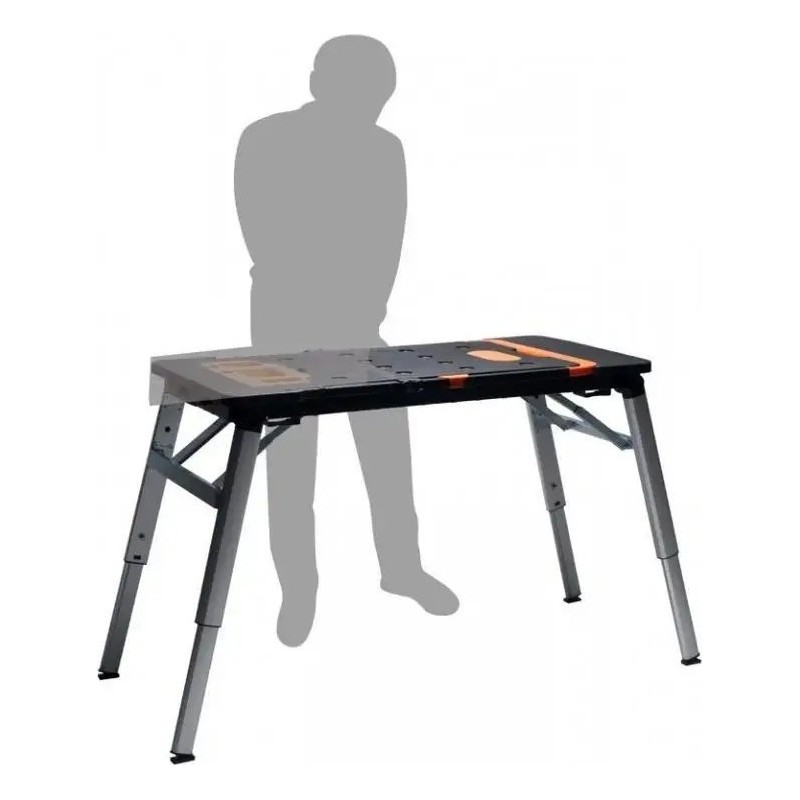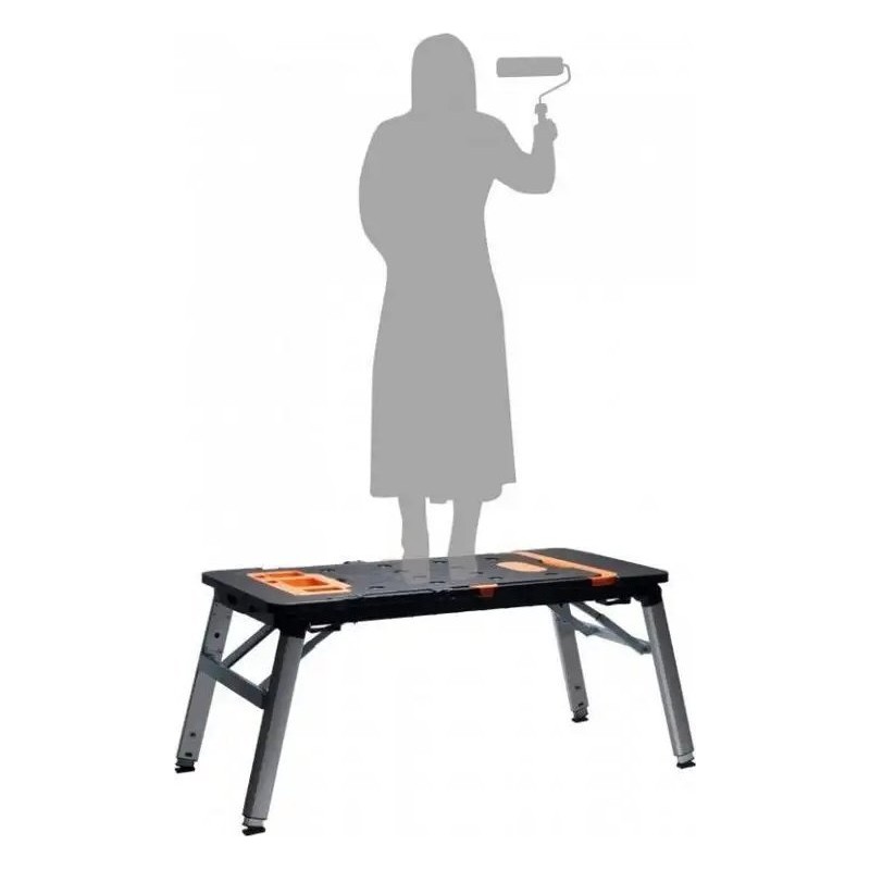 Er verfügt über eine riesige Arbeitsfläche, dank der das Sägen und Schrauben kinderleicht ist. An der Seite befindet sich eine eingebaute Steckdose. Er kann als stabiles Gerüst oder als Arbeitsplattform verwendet werden. Im Lieferumfang sind Rollen enthalten, mit denen sich der Tisch in einen Rollwagen verwandeln lässt. Er ist außerdem mit einer Werkbank-Liegefläche ausgestattet, was in Autowerkstätten, Kfz-Servicebetrieben und für Heimwerker nützlich ist. Er lässt sich zu einer handlichen Kofferform zusammenklappen, die sich leicht verstauen und transportieren lässt.