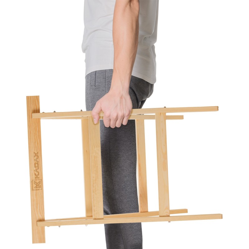 Kompakt – die von der Marke Kadax angebotenen Holzstützen lassen sich problemlos verstauen. Die Gesamtmaße der Stützen betragen 70 x 80 Zentimeter, bei einem Gewicht von nur 4 Kilogramm.