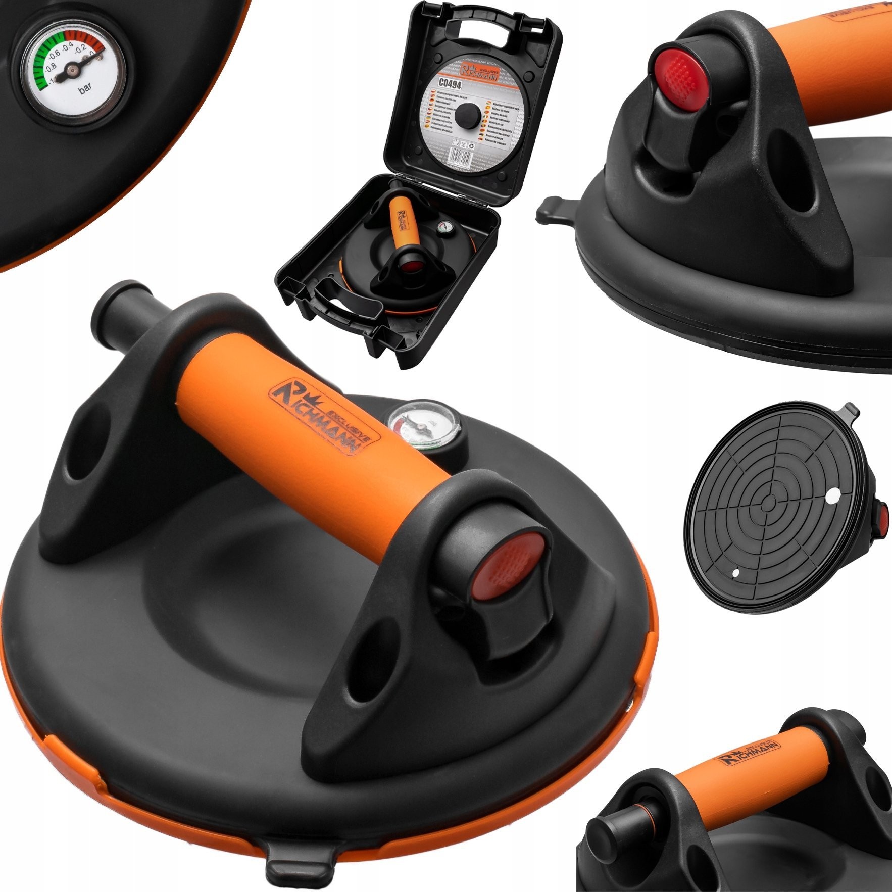 - VAKUUMPUMPE – Beim Pumpen erzeugen Sie ein Vakuum, das das jeweilige Element an der Halterung festsaugt. Nach der Verwendung des Saugnapfes genügt es, das Ablassventil zu öffnen, um den Druck zu verringern und die Halterung zu lösen.