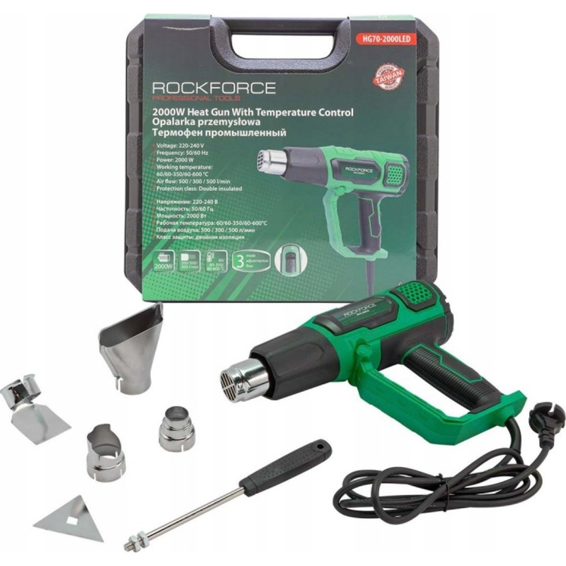 Rockforce Elektrische Heißluftpistole mit Düsen (230 V, 50/60 Hz, 2000 W, 60/350/600 °C, 50/300/500 l/min)
