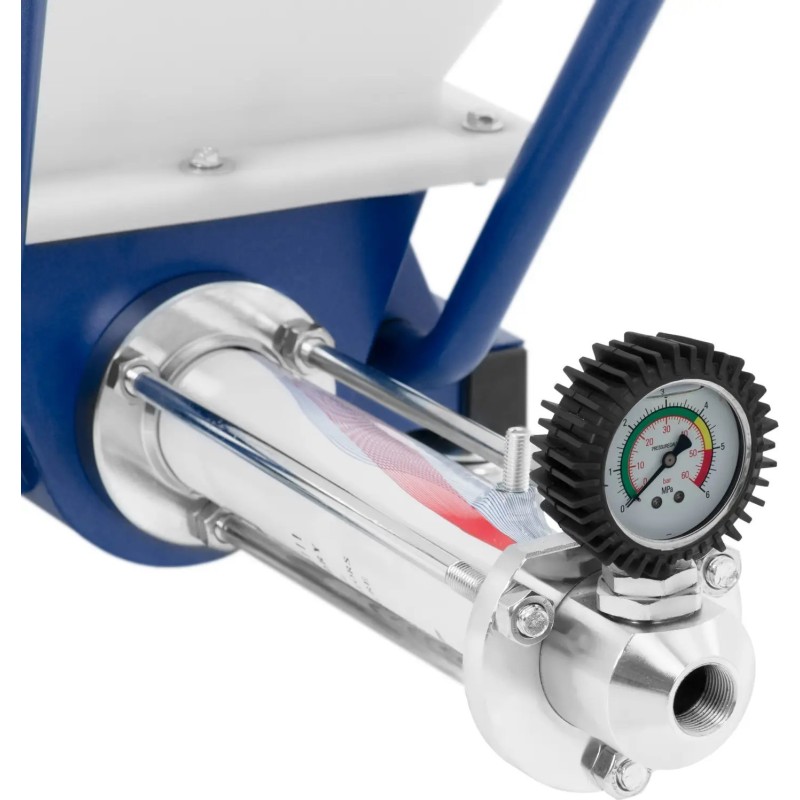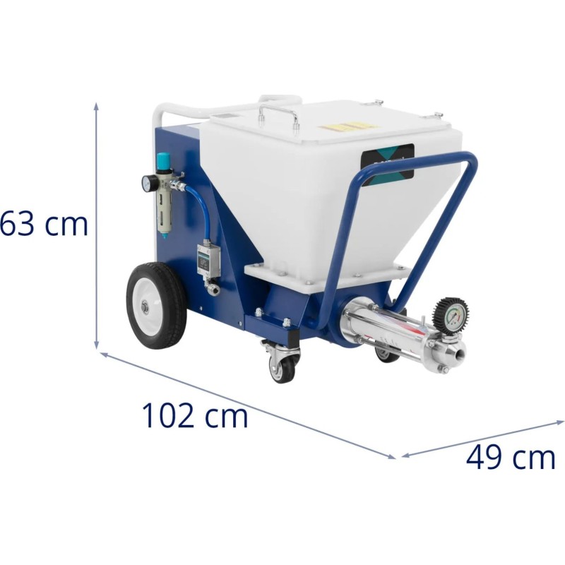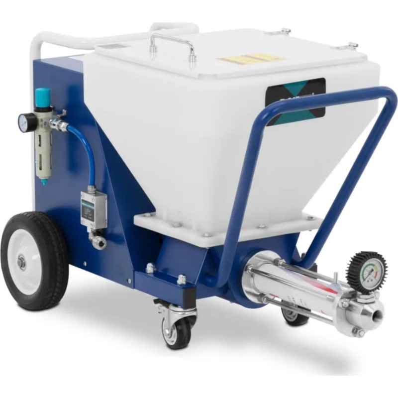 Auf diese Weise haftet der Mörtel an der senkrechten Fläche und bildet eine gleichmäßige Schicht, die nur noch geglättet werden muss. Die Bedienung der Putzmaschine ist äußerst einfach und gewährleistet maximale Bewegungsfreiheit. Es reicht aus, sie an einen Kompressor anzuschließen und den Eingangsdruck mithilfe eines Druckminderers einzustellen. Die Drehrichtung und die Drehzahl des Rotors werden je nach Materialart und der zur Herstellung der Masse verwendeten Wassermenge über ein übersichtliches Bedienfeld eingestellt. Das Gerät erzielt die besten Ergebnisse bei Material mit einer Korngröße von bis zu 3 mm. Der Mischschlauch ist 10 m