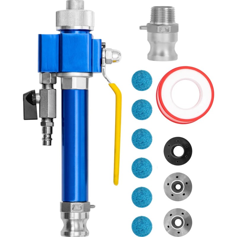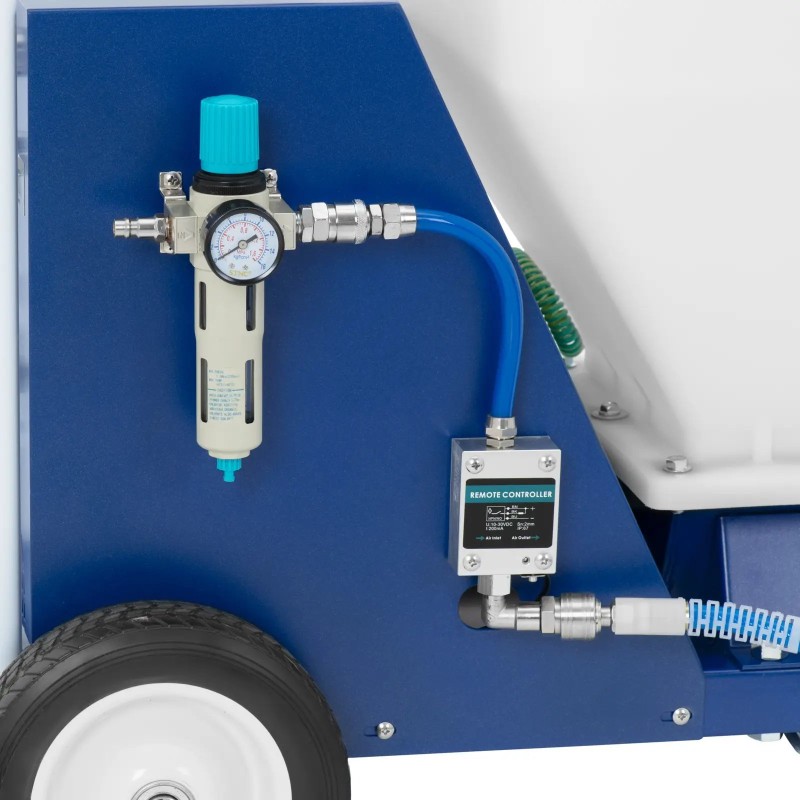Für den Betrieb der Maschine ist ein Luftkompressor erforderlich. Je nach Material empfehlen wir einen Kompressor mit einer Leistung von 3 bis 7,5 PS. Der Putzbehälter hat ein Fassungsvermögen von 40 Litern