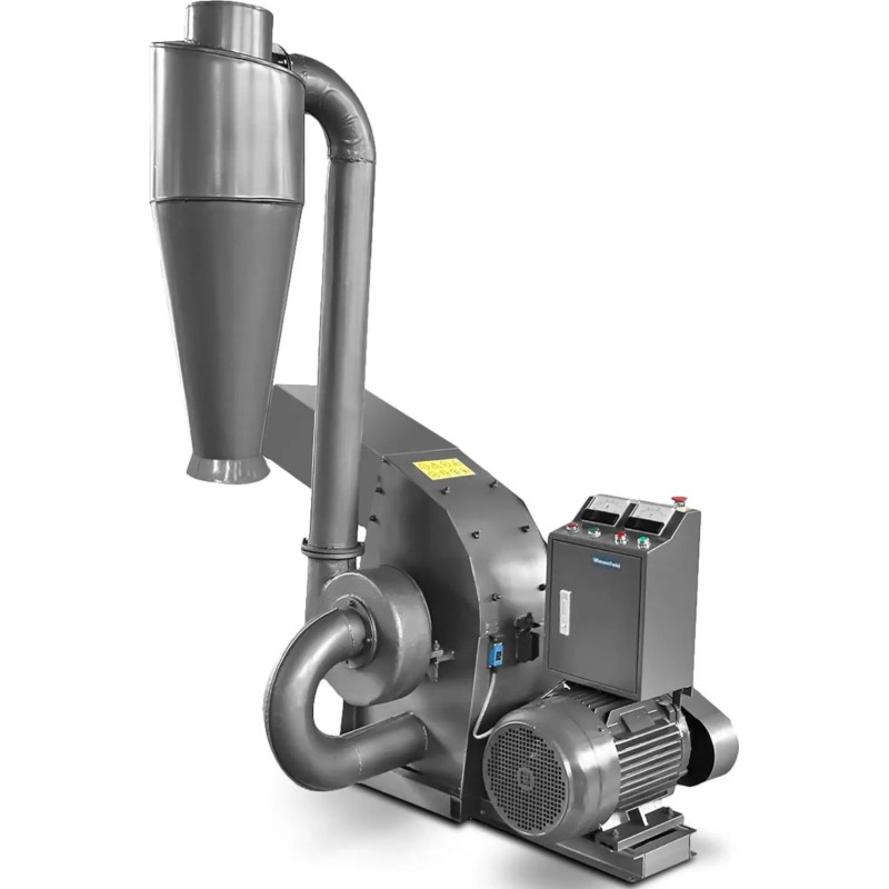 erhältlich. Das fertige Mahlgut wird gezielt über einen Zyklon abgefüllt. Der Getreide-Schlagmahlwerk besticht durch einfache Bedienung, einen großen Behälter und eine robuste Konstruktion. Dies ermöglicht die Herstellung und Verarbeitung großer Mengen an Mahlgut. Ein stabiler Sockel garantiert einen sicheren Betrieb.