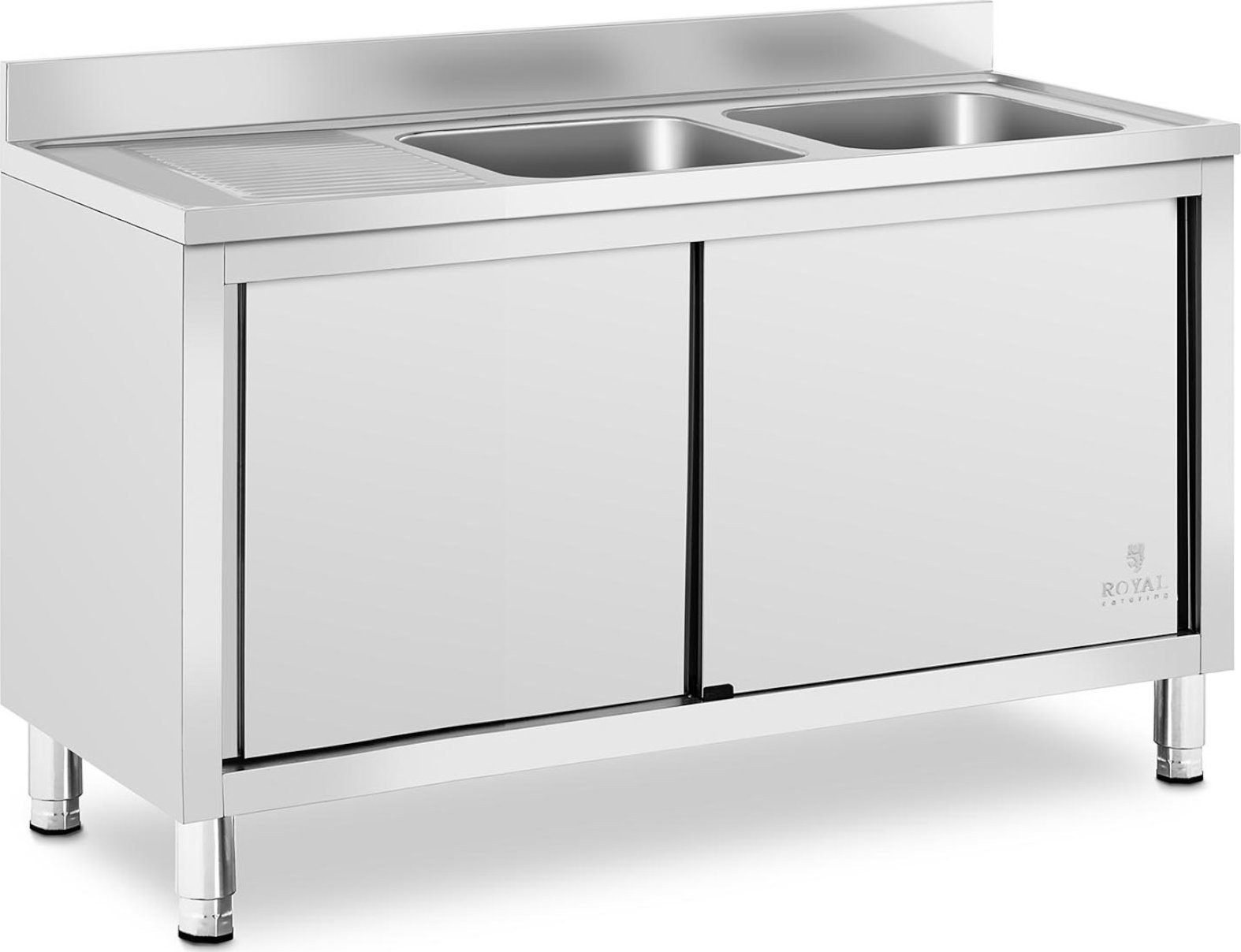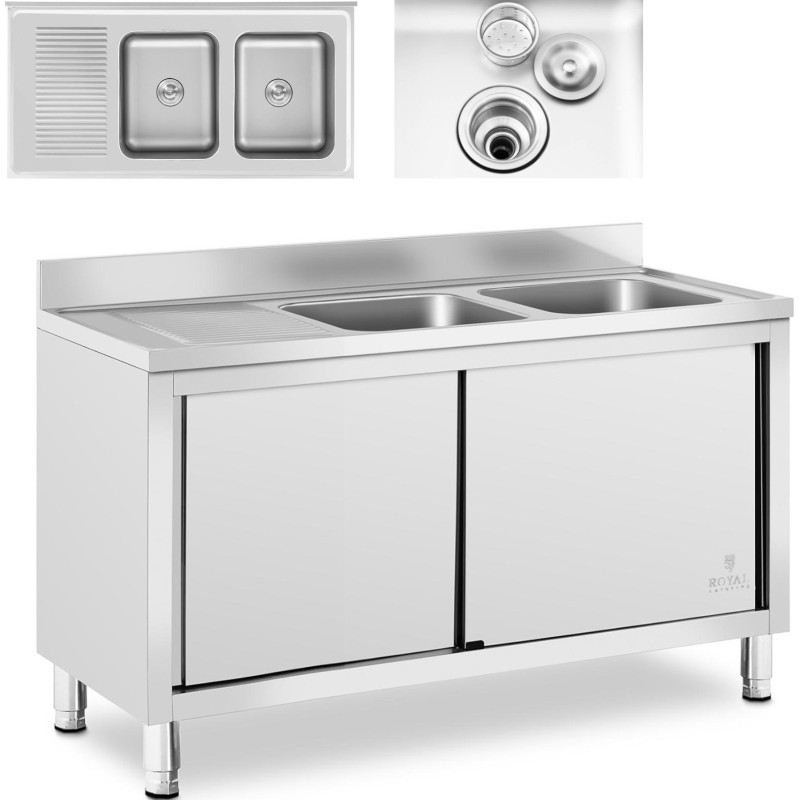 Royal Catering Zweikammer-Gastronomie-Spülbecken mit Schrank mit Schiebetüren 140 x 70 x 95 cm Gastronomie-Spülbecken