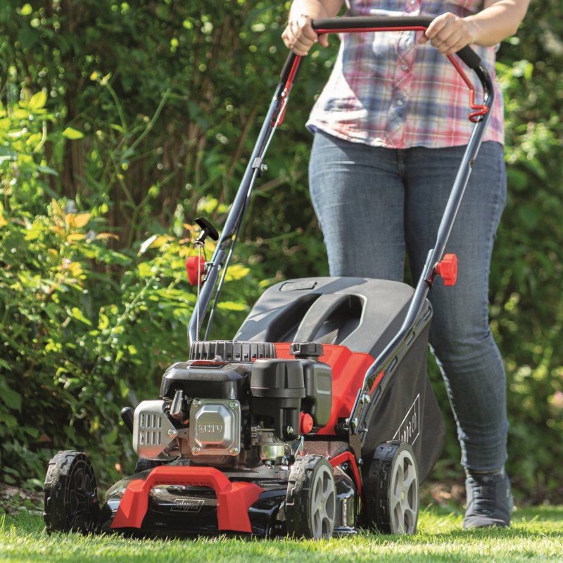 Ausgestattet mit einem 4-Takt-Motor mit 131 cm³ Hubraum erzeugt der Rasenmäher eine Leistung von 3,3 PS (2,4 kW), was sich in hoher Leistungsfähigkeit und Zuverlässigkeit während des Betriebs niederschlägt. Die Drehzahl von 2800 U/min sorgt für effektives Mähen, und die Luftkühlung erhöht die Lebensdauer des Motors.