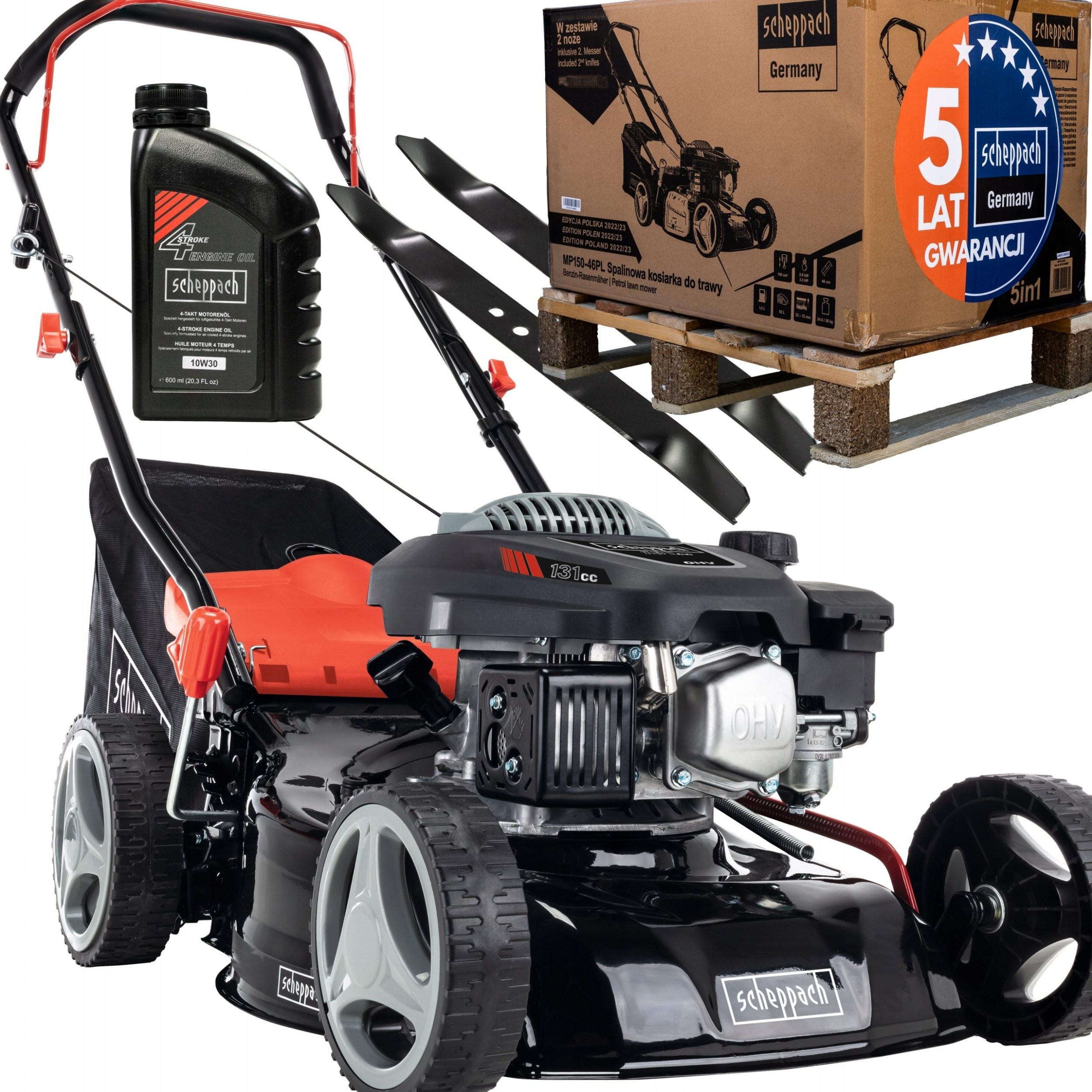 Im Lieferumfang ist außerdem 0,6 l Motoröl enthalten, das für einen angemessenen Schutz des Motors und dessen Langlebigkeit sorgt. Die Verwendung von Originalprodukten erhöht die Effizienz und Sicherheit beim Einsatz des Rasenmähers.