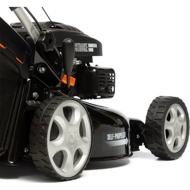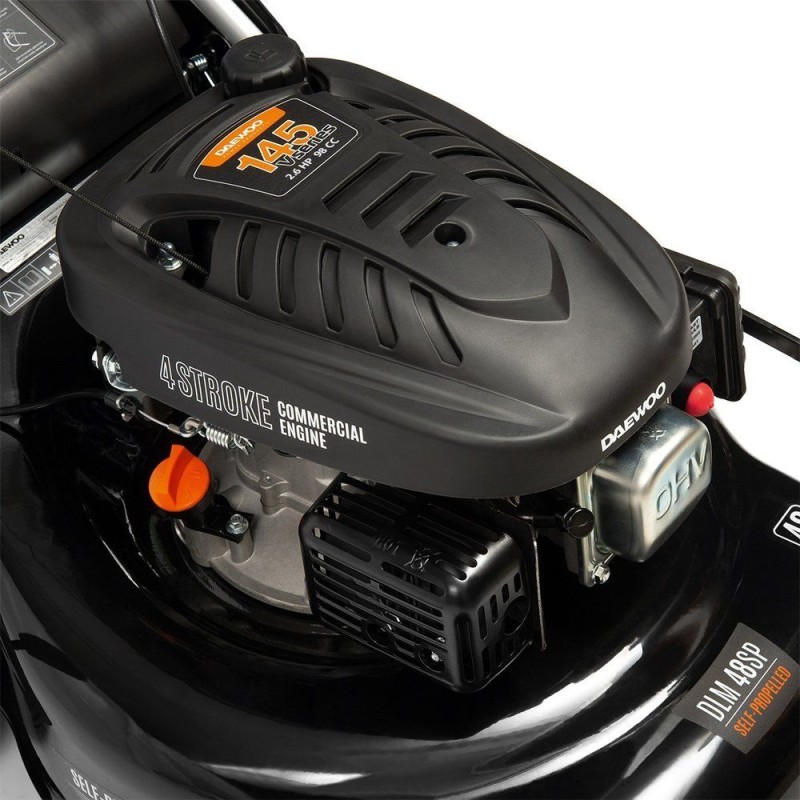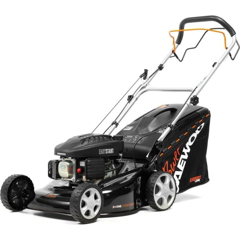 Das Gehäuse des Geräts besteht aus Metall und ist somit widerstandsfähig gegen intensive Nutzung. Sein aerodynamisch geformtes Messer saugt das gemähte Gras während der Drehung in den Grasfangkorb. Das Gerät ist mit einem zuverlässigen 4-Takt-Motor von DAEWOO ausgestattet, der stabil und ohne Leistungsverlust läuft. Sein Hubraum beträgt 98,5 cm³ und die Leistung liegt bei 2,6 PS. Außerdem kommt hier der Handstarter „Easy Start“ zum Einsatz, der ein sehr einfaches Starten bereits beim ersten Ziehen am Starterseil ermöglicht.