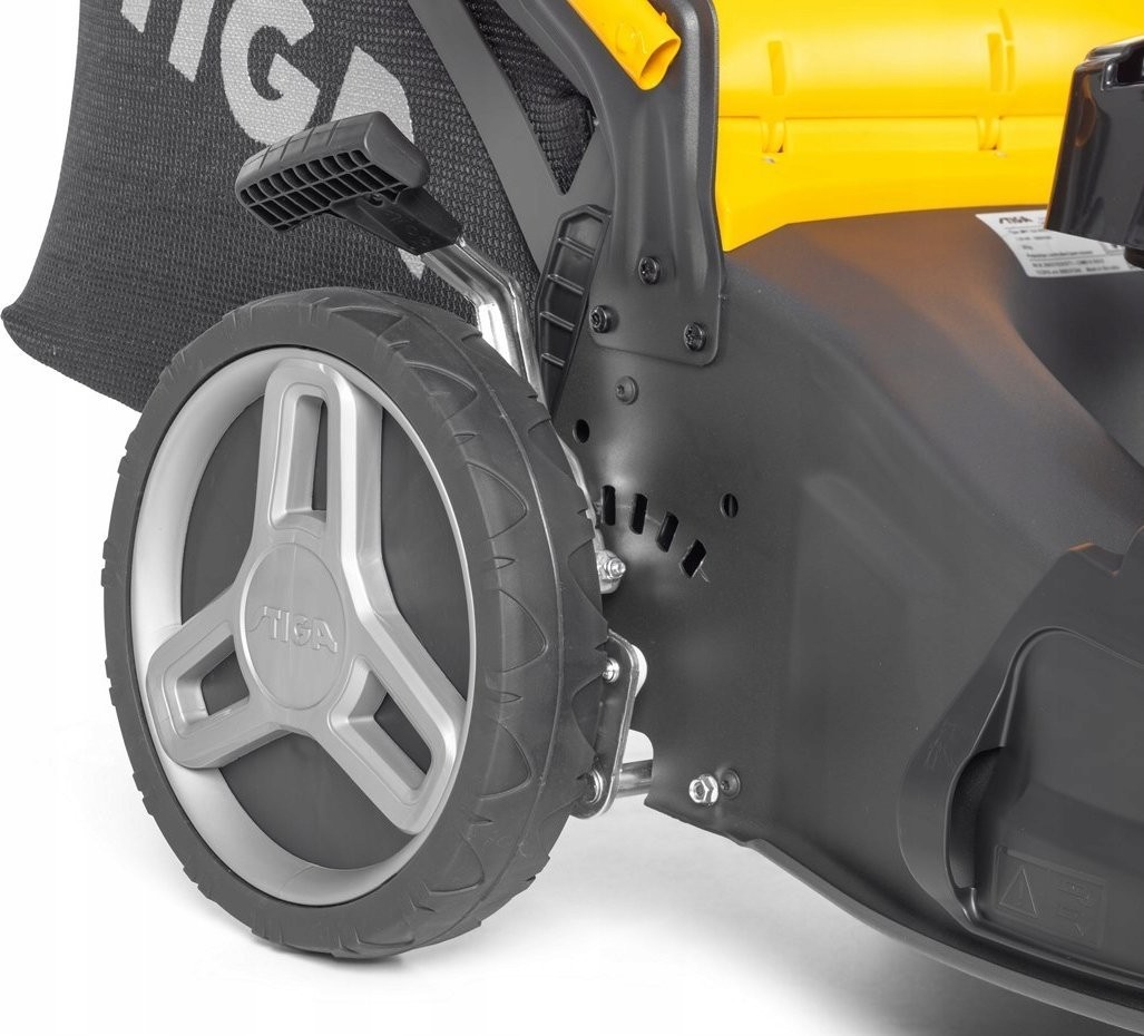 Große Räder schonen den Rasen und sorgen für bessere Traktion, während das doppelte Kugellager ein leichtes Manövrieren auf Rasenflächen oder unebenem Gelände gewährleistet. Der Radantrieb garantiert optimalen Arbeitskomfort beim Mähen.