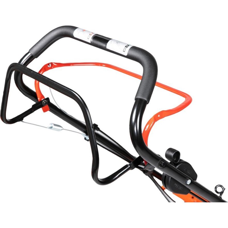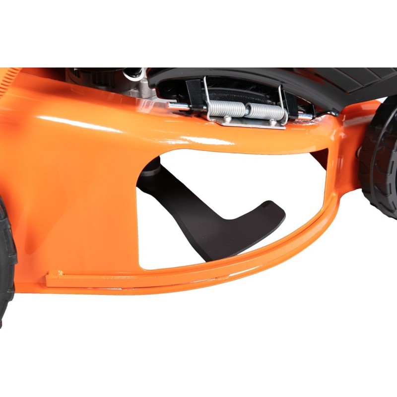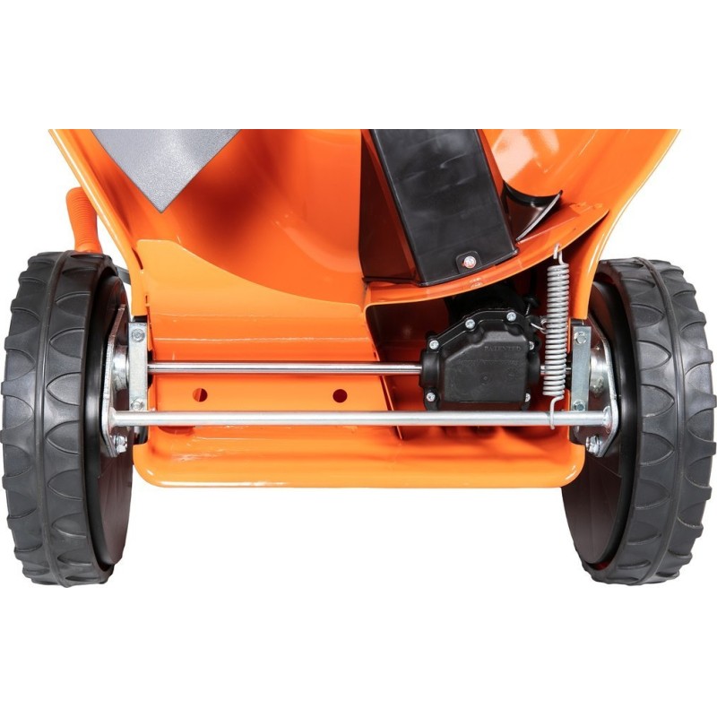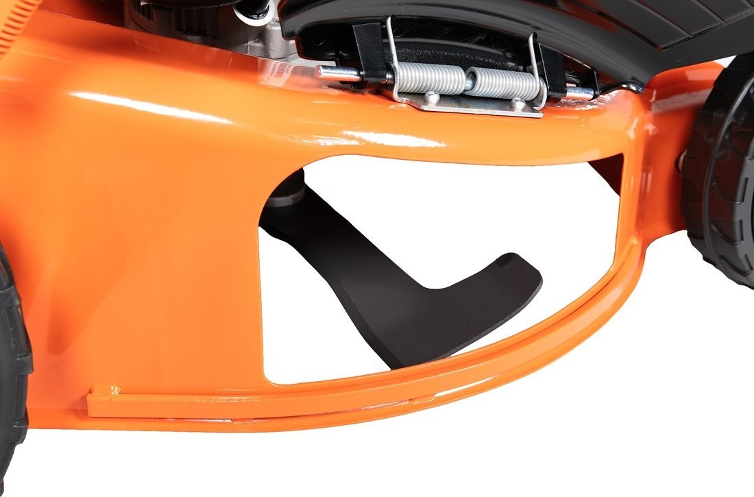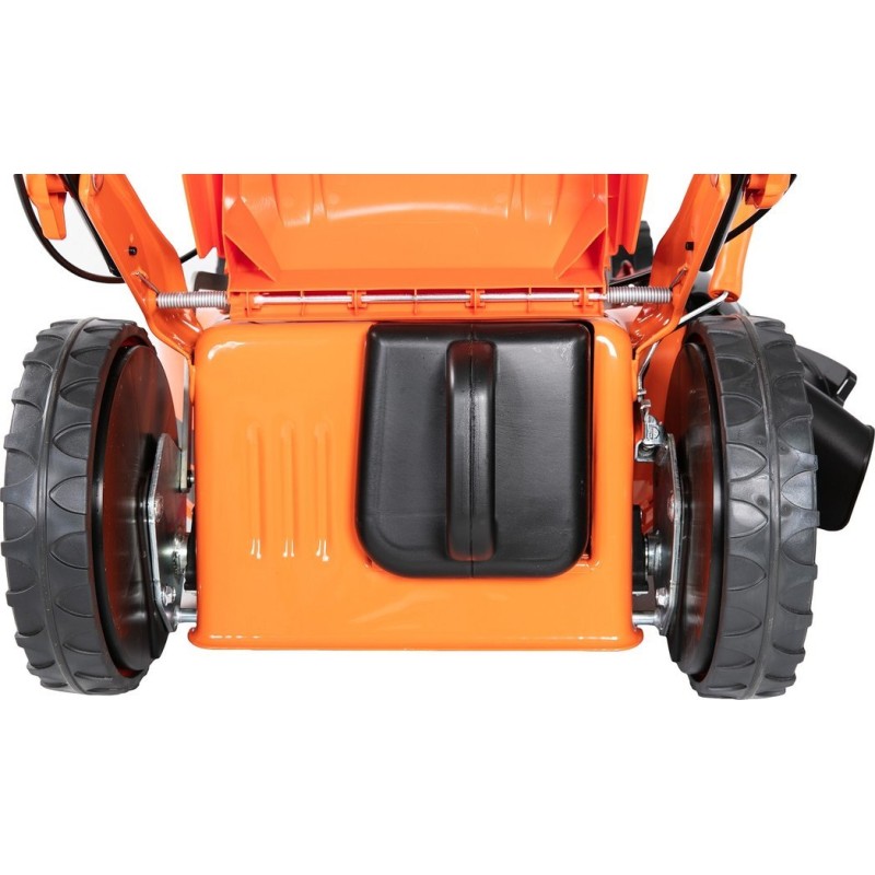 Der Rasenmäher ist mit großen Rädern mit einem Durchmesser von 200 mm vorne und 280 mm hinten ausgestattet, was für bessere Manövrierbarkeit und Fahrkomfort sorgt, selbst auf unebenem Gelände. So wird das Mähen zum Vergnügen und nicht zu einer lästigen Pflicht.