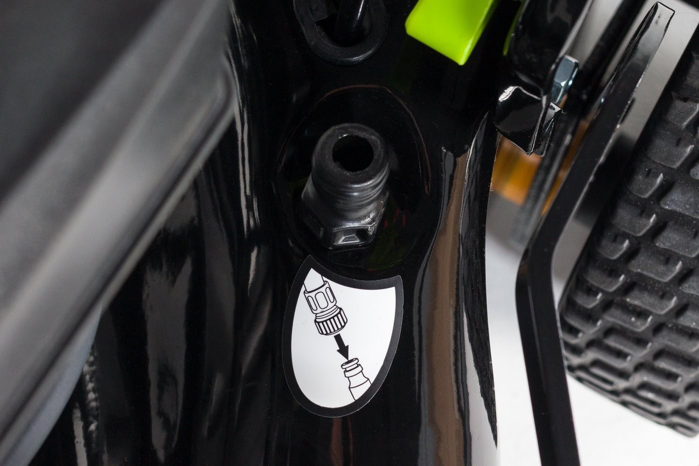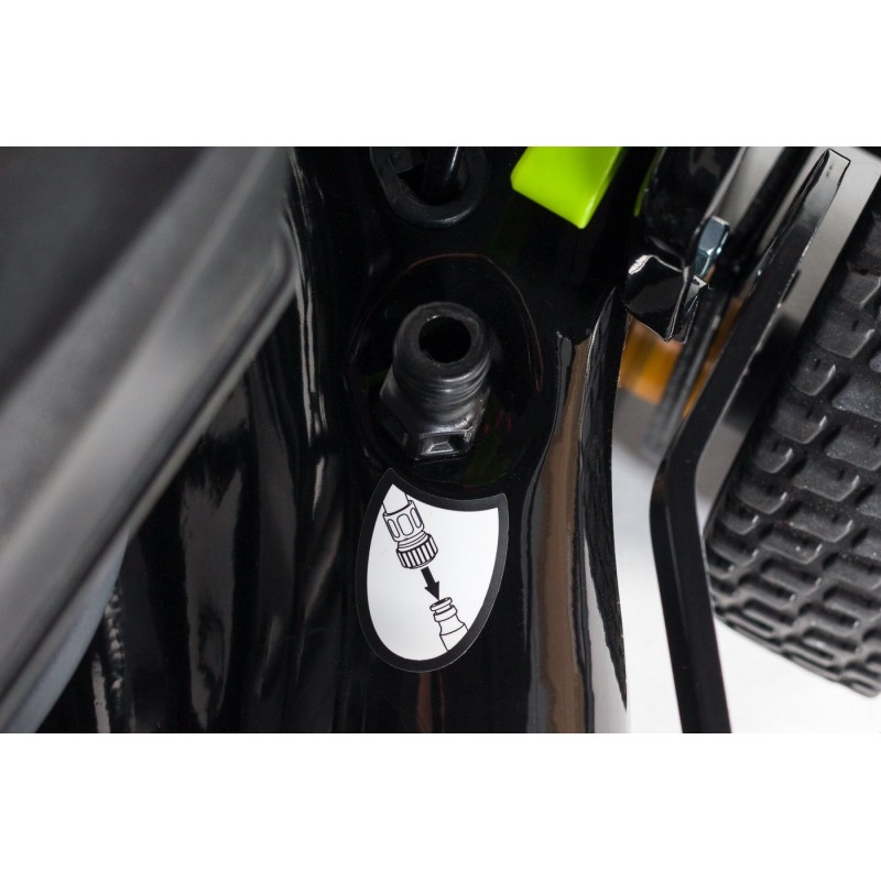 Der Rasenmäher ist mit einem Gehäusereinigungssystem ausgestattet, das eine einfache Reinigung der Innenseite des Gehäuses ermöglicht. Schließen Sie einfach den Gartenschlauch an den Schnellanschluss an und starten Sie den Motor, damit der Wasserstrahl das Gehäuse während der Rotation des Messers effektiv reinigt.