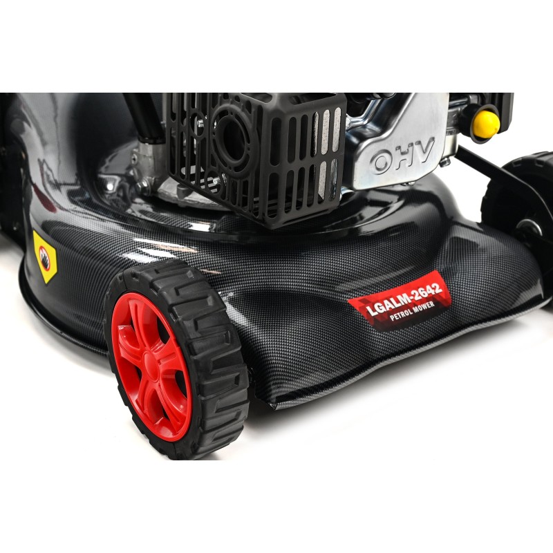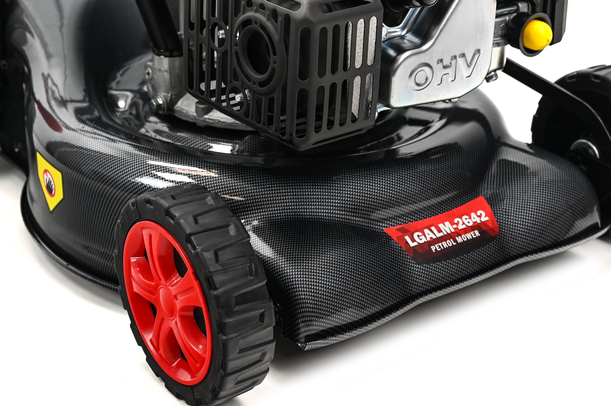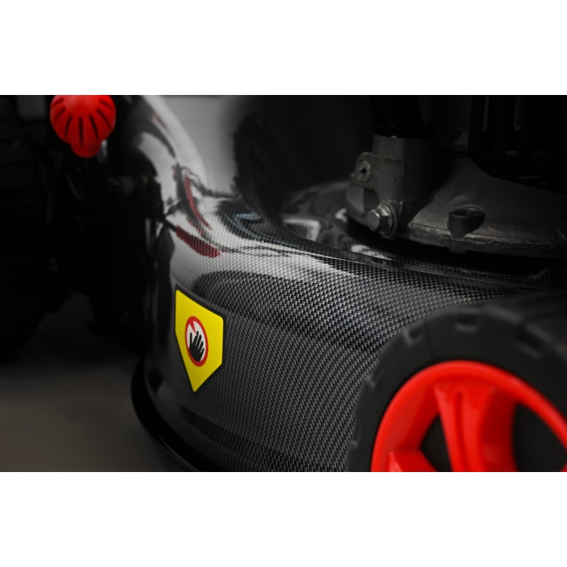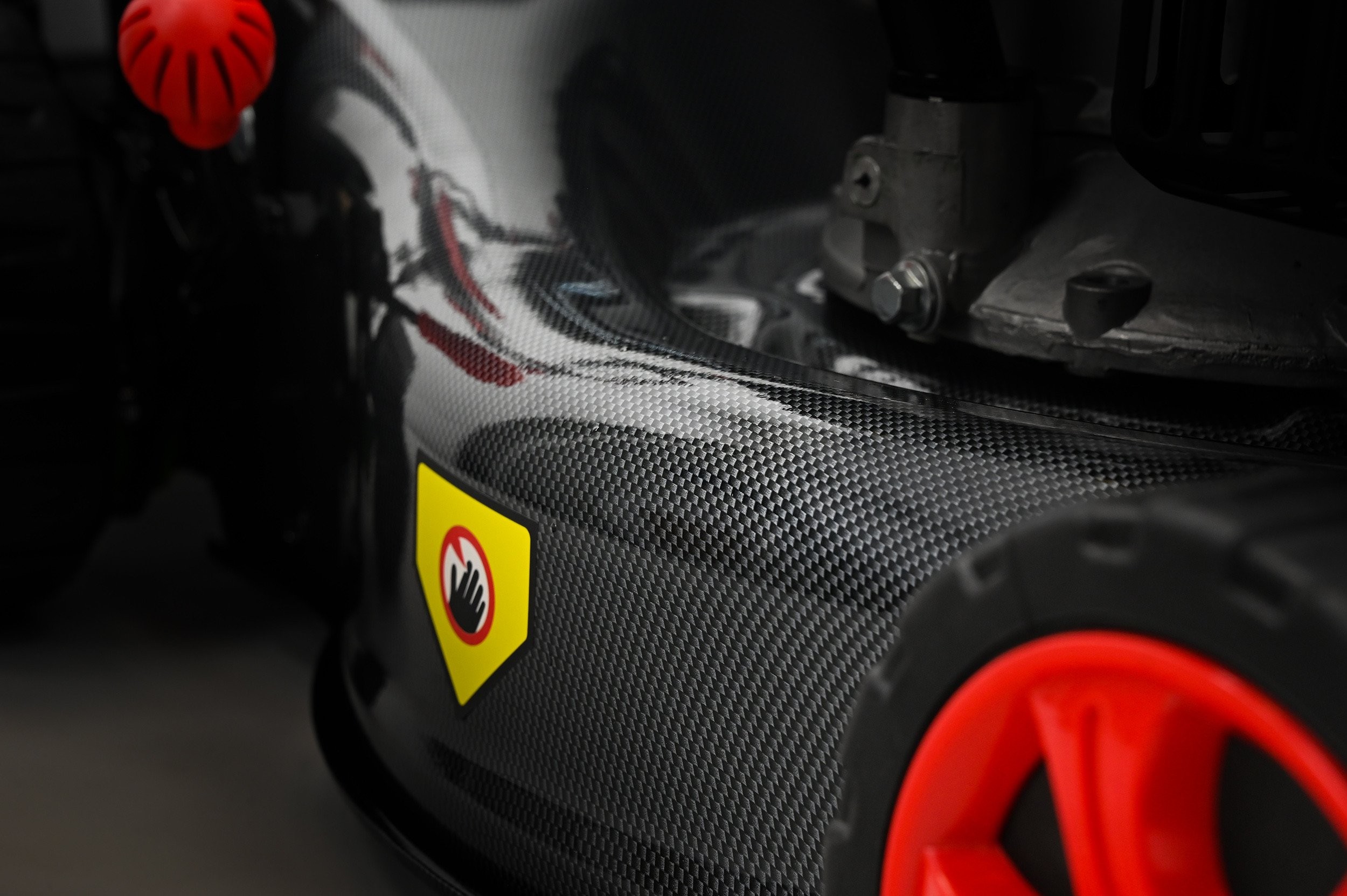 - Das Carbon-Design ist ein echter Blickfang und hebt das Gerät von anderen ab – dank der modernen Oberfläche wirkt der Rasenmäher professionell und repräsentativ, was insbesondere für Unternehmen im Gartenbau von Bedeutung sein kann.