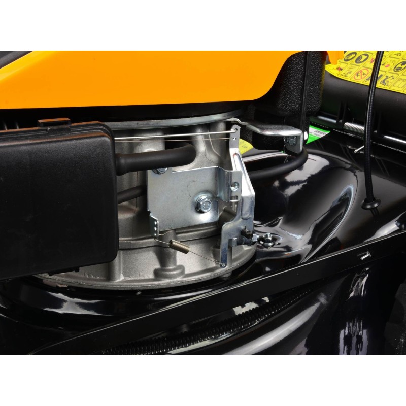 Er verfügt über gelagerte Räder mit einem Durchmesser von 15 cm, wodurch sich der Rasenmäher leicht führen lässt und beim Manövrieren keine Probleme bereitet. Das Gehäuse des Rasenmähers besteht aus pulverbeschichtetem Stahlblech, das gegen Steinschlag und Rost beständig ist.
