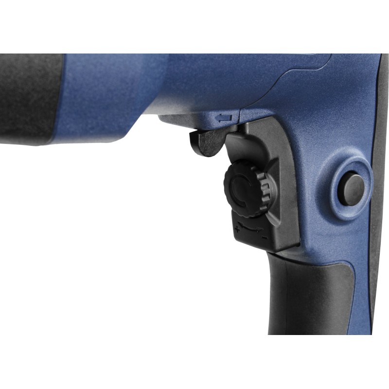 Neben dem Bohren von Löchern in Stein und Beton kann der Bohrhammer auch für Meißelarbeiten eingesetzt werden. Dank dieser Funktion können wir Betonflächen, z. B. Wände, aufbrechen oder Fliesen von Wänden abmeißeln, indem wir den entsprechenden Aufsatz verwenden. Die zum Bohren erforderliche Drehbewegung lässt sich über einen Schalter am Gerät vollständig ausschalten. Auf diese Weise wird unser Gerät zu einem leichten Hammer, der selbstständig in Materialien unterschiedlicher Härte meißeln kann.