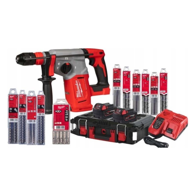 - Bohrhammer M18BLHX - 2 x 5,0-Ah-Akku - Ladegerät M12-18FC - Packout-Koffer - 30 x SDS-Plus-Bohrer MX4 6x165 mm - 30 x SDS-Plus-Bohrer MX4 8x165 mm - 10 x SDS-Plus-Bohrer MX4 10x215 mm - 10 x SDS-Plus-Bohrer MX4 12x210 mm - 10 x SDS-Plus-Bohrer MX4 12x260 mm - SDS-Plus-Bohrerset 4932352833