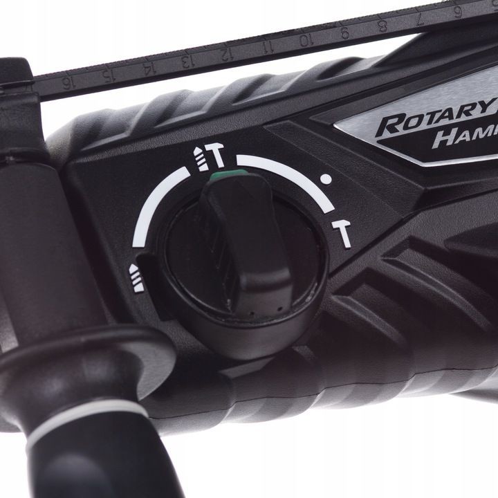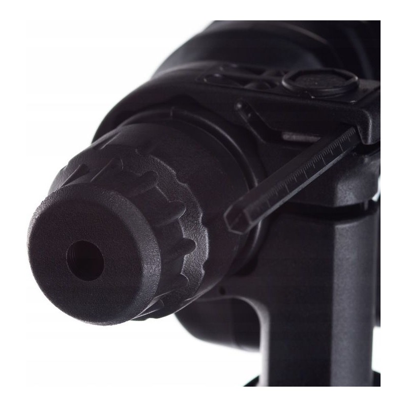 Neben dem Bohren von Löchern in Stein und Beton kann der Bohrhammer auch für Meißelarbeiten eingesetzt werden. Dank dieser Funktion können wir Betonflächen, z. B. Wände, aufbrechen oder Fliesen von Wänden abmeißeln, indem wir den entsprechenden Aufsatz verwenden. Die zum Bohren erforderliche Drehbewegung kann über einen Schalter am Gerät vollständig ausgeschaltet werden. Auf diese Weise wird unser Gerät zu einem leichten Hammer, der selbstständig in Materialien unterschiedlicher Härte meißeln kann.