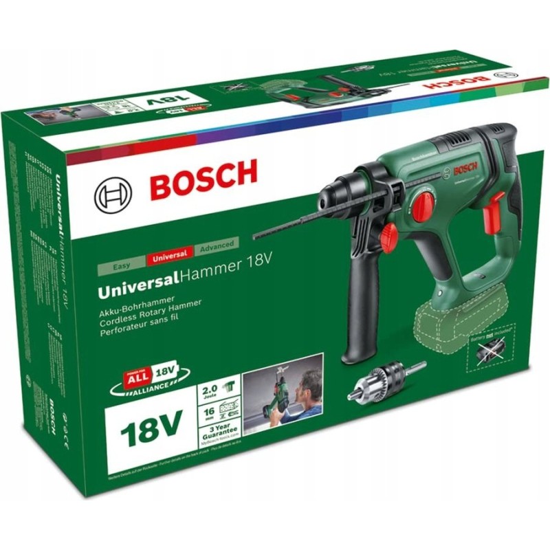 - Artikelname: Bosch Home & Garden Akku-Schlagbohrhammer 18 V, ohne Akku, 18-V-System, mit Rundschaftadapter, zum Bohren, Schlagbohren, Meißeln und Schrauben, im Karton