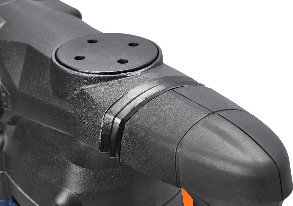 Neben dem Bohren von Löchern in Stein und Beton kann der Bohrhammer auch für Meißelarbeiten eingesetzt werden. Dank dieser Funktion können wir Betonflächen, z. B. Wände, aufbrechen oder Fliesen von Wänden abmeißeln, indem wir den entsprechenden Arbeitsaufsatz verwenden. Die zum Bohren erforderliche Drehbewegung kann über einen Schalter am Gerät vollständig ausgeschaltet werden. Auf diese Weise wird unser Gerät zu einem leichten Hammer, der selbstständig Materialien unterschiedlicher Härte bearbeiten kann.