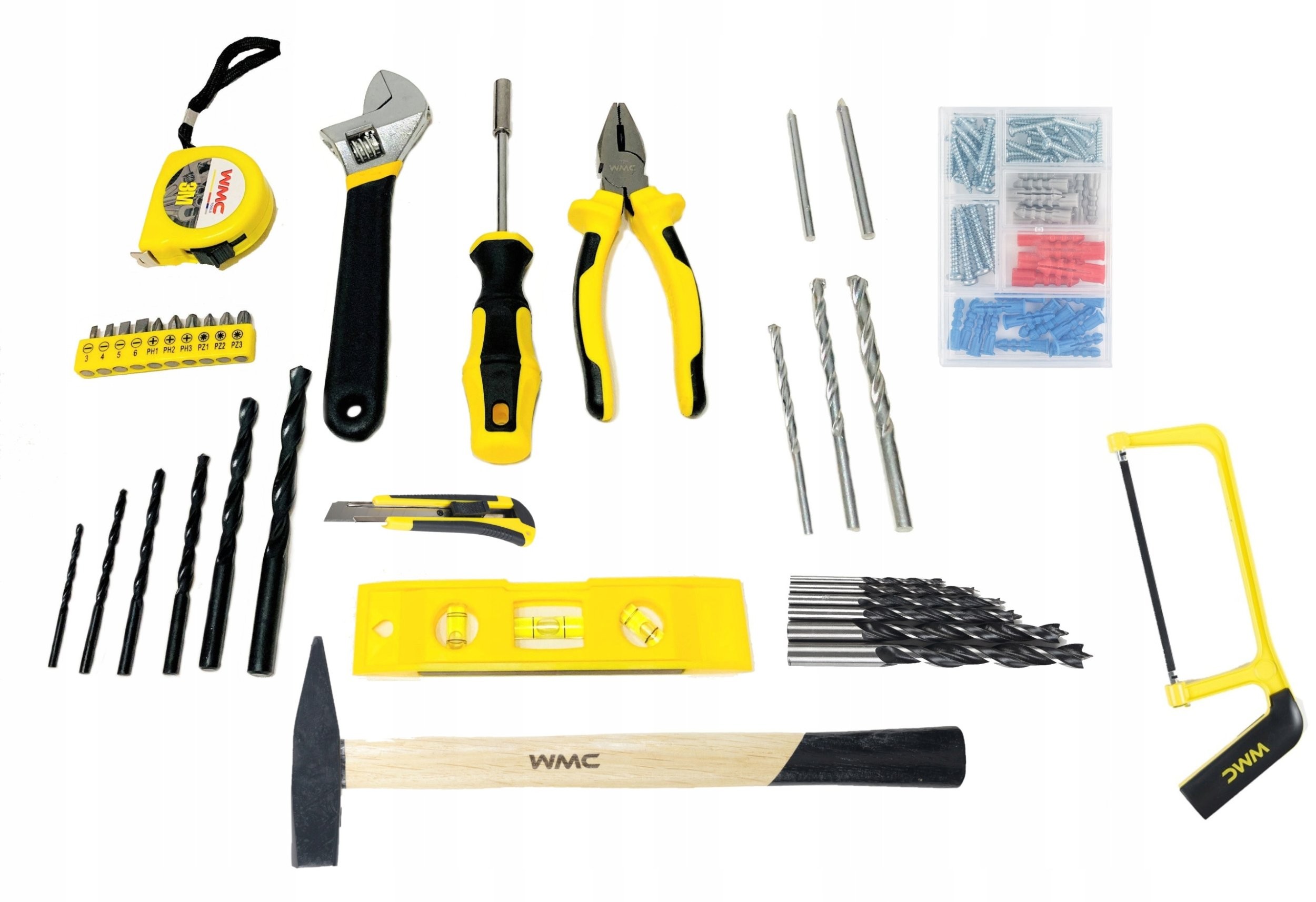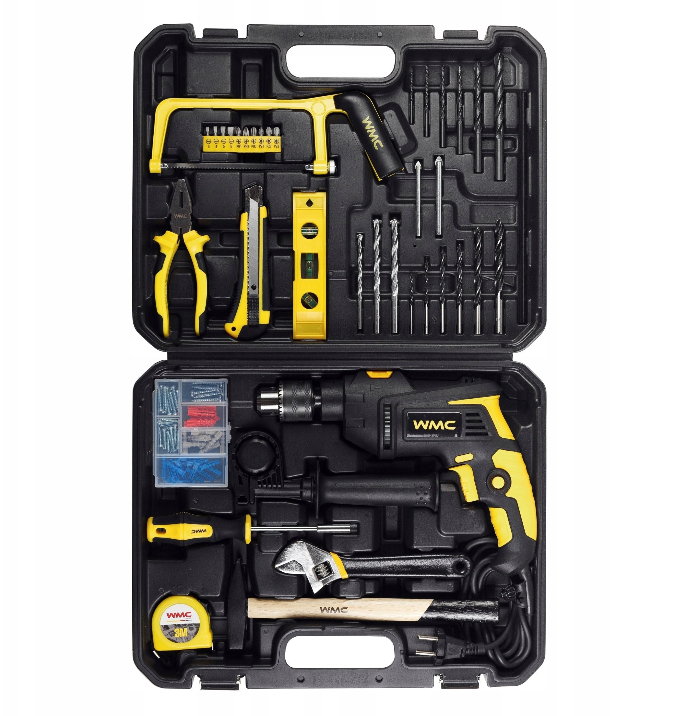 - Lieferumfang: Bohrmaschine, Bohrer für Metall, Beton, Keramikfliesen, Holz, Bits, Zange, Wasserwaage, Metallsäge, Messer, Schraubenschlüssel, Hammer, Maßband, Befestigungselemente, Koffer