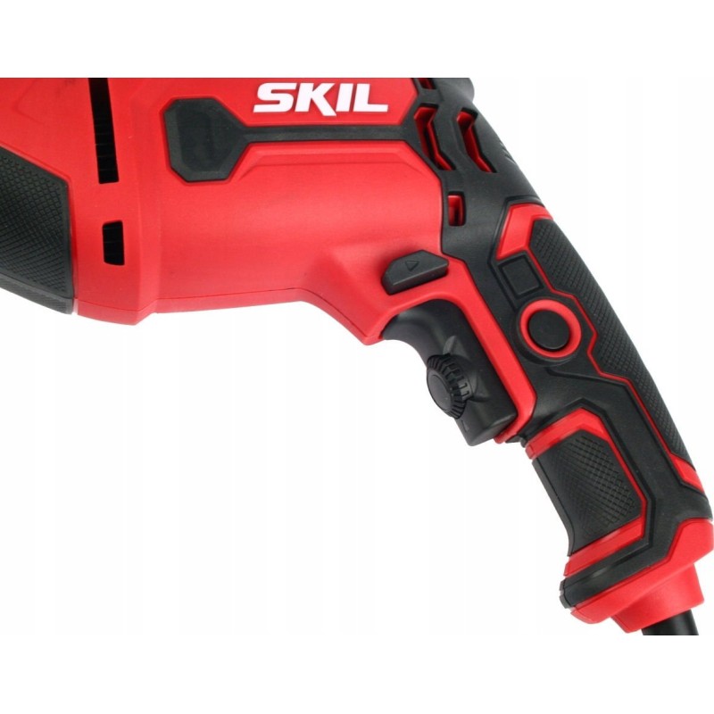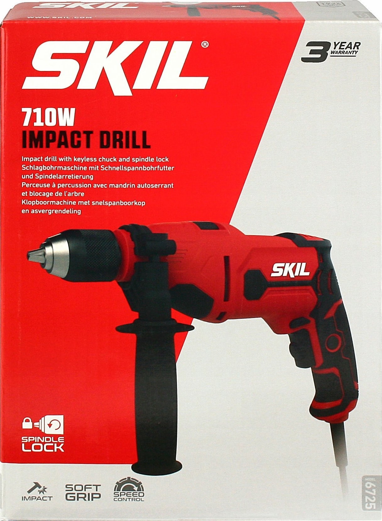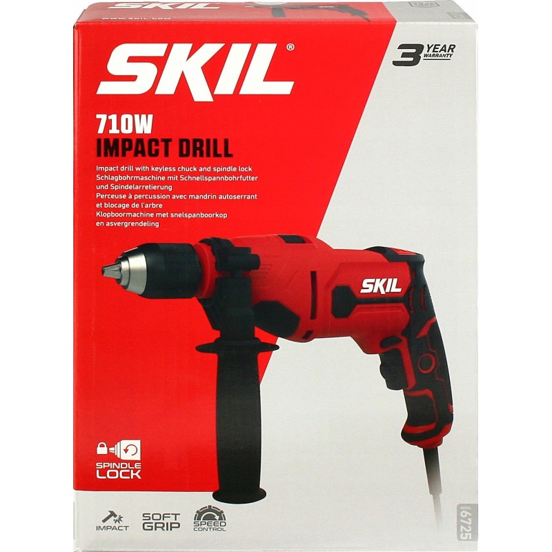Der SKIL 6725 Schlagbohrer mit einer Motorleistung von 710 W ist für das Bohren von Löchern in Ziegel, Mauerwerk, Holz, Metall, Keramikfliesen und Kunststoffen vorgesehen. Der Schlagmechanismus ermöglicht das Bohren in Mauerwerk, wobei diese Funktion beim normalen Bohren und Schrauben ausgeschaltet werden kann. Das Werkzeug ist mit einem metallenen Schnellspannbohrfutter mit 13 mm Durchmesser und einer einzigen Hülse ausgestattet, wodurch ein Herausfallen des Bohrers während der Arbeit verhindert wird. Die Spindelarretierung erleichtert den Wechsel der Zubehörteile. Die Drehzahlregelung und -vorwahl sorgen zusätzlich für Vielseitigkeit und Kontrolle bei der Arbeit. Es besteht auch die Möglichkeit, den Schalter zu arretieren, um die Arbeit beim Bohren und Schrauben fortzusetzen. Die Schlagbohrmaschine verfügt über viele nützliche Funktionen, wie z. B. die Drehrichtungsumkehr, was besonders beim Lösen von Schrauben nützlich ist. Zudem sorgt das ergonomische Design mit Softgriff für mehr Arbeitskomfort. Das Modell SKIL 6725 AA ist mit einem Seitengriff und einem Tiefenanschlag ausgestattet.