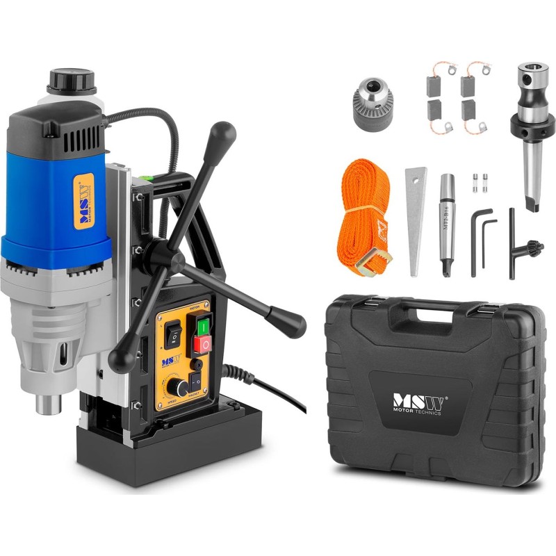 Die MSW-Magnetbohrmaschine ermöglicht dank ihrer Konstruktion den Einsatz unter schwierigen Bedingungen und in verschiedenen Positionen, z. B. vertikal. Dies wird durch einen starken Elektromagneten mit einer Kraft von 11.500 N ermöglicht, der das Gerät in einer stabilen Position hält. Das relativ geringe Gewicht und das lange Netzkabel (2 m ) ermöglichen es, die Bohrmaschine an jedem beliebigen Ort aufzustellen. Der Koffer erleichtert den Transport des gesamten Sets. Für eine
