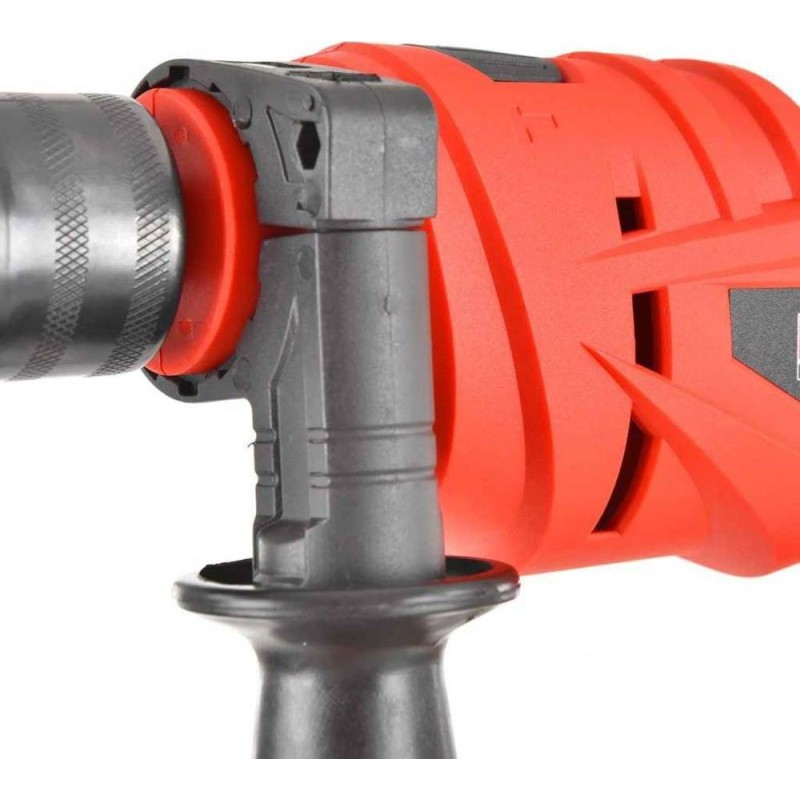 Die elektrische Schlagbohrmaschine HECHT 1070 der tschechischen Marke Hecht findet sicherlich in jedem Haushalt, jeder Garage oder jeder Werkstatt Verwendung. Sie eignet sich zum Bohren von Löchern mit unterschiedlichen Durchmessern in verschiedenen Materialien. Dank der Drehzahlregelung am Startknopf kann die Bohrmaschine auch als Schraubmaschine eingesetzt werden. Der Schalter zur Umschaltung der Drehrichtung befindet sich über dem Startknopf, was eine schnelle Umschaltung ermöglicht. Um den Schlagbetrieb einzustellen, genügt es, die Position des Schalters am oberen Teil der Bohrmaschine zu verändern. Der gummierte Griff sorgt für einen sicheren Halt und reduziert gleichzeitig die Übertragung von Vibrationen. Der zusätzliche, in jeder Ebene verstellbare Seitengriff sorgt für einen besseren Anpressdruck beim Bohren. Die Bohrmaschine ist mit einem Tiefenanschlag für die Bohrlöcher ausgestattet. Das Gerät ist mit einem 230 V/50 Hz-Elektromotor mit einer Leistung von 650 W ausgestattet, der eine Leerlaufdrehzahl von bis zu 3000 [U/min] gewährleistet. Die Bohrmaschine ermöglicht Bohrungen mit folgenden Durchmessern: Metall – 13 mm, Beton – 13 mm, Holz – 25 mm.