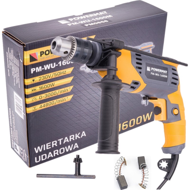 Die elektrische Bohrmaschine der polnischen Marke POWERMAT mit einer Leistung von 1600 W ist mit einer stufenlosen Drehzahlregelung und einer Taste für Dauerbetrieb ausgestattet, was die Arbeit erheblich erleichtert. Sie ist für das Schlagbohren in Mauerwerk, Beton und Stein sowie für das Bohren in Metall, Keramik, Holz und Kunststoff vorgesehen.