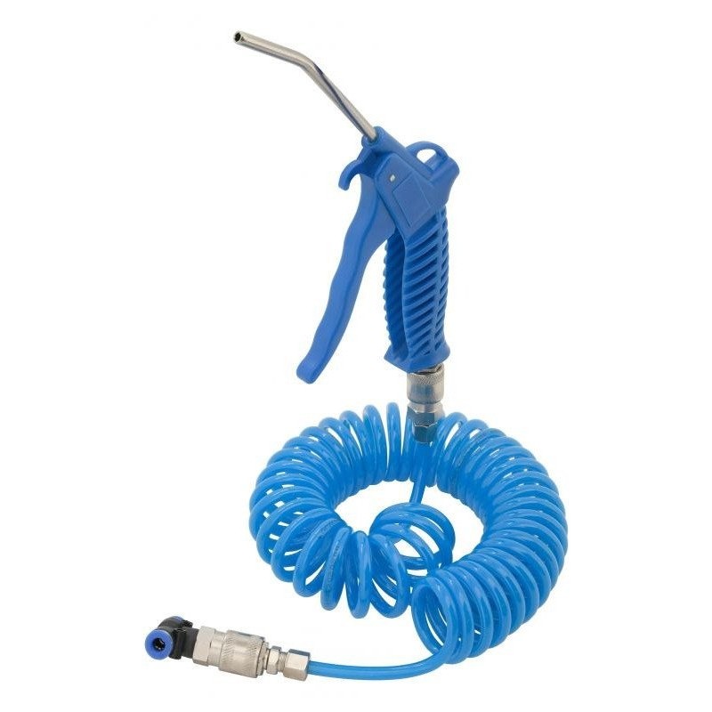 Es eignet sich besonders für schwer zugängliche Stellen. Der vordere Teil des Gehäuses ist mit einem geformten Aufhängehaken ausgestattet, und im unteren Bereich befindet sich eine Metall-Schnellkupplung. Der Schlauch mit einem Durchmesser von 6 mm und einer Länge von 5 m ist gewendelt und verfügt an einem Ende über eine Schnellkupplung zum schnellen Anschließen der Pistole sowie am anderen Ende über eine Schlauchklemme zum Anschließen des Adapters. Der T-Adapter ist für den Anschluss an einen 6-mm-Druckluftschlauch sowie für den Anschluss an das Ende des gewendelten Schlauchs mittels Schnellkupplung vorgesehen