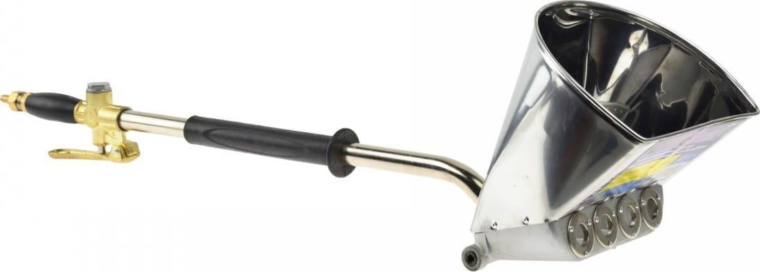 Hochwertige pneumatische Verputzmaschine zum Auftragen verschiedener Arten von Gips-, Zement-, Kalk-, Kalk-Zement-, Ton- und Sanierungsputzen sowie herkömmlichen Putzen auf Decken. Die Verputzmaschine besteht aus hochwertigem Edelstahl und Aluminium. Die Düsen aus einer hochwertigen Metalllegierung gewährleisten einen langlebigen und störungsfreien Betrieb. Produkteigenschaften: hohe Verarbeitungsqualität, für das Verputzen von Decken bestimmt, aus hochwertigem Edelstahl und Aluminium gefertigt, Düsen aus einer hochwertigen Metalllegierung, die Spritzmaschine beschleunigt und erleichtert die Verputzarbeiten erheblich. Technische Daten: Material: Aluminium, Edelstahl, Kunststoff Durchmesser der Auslassöffnungen: 19 mm Anschluss: 1/2” Betriebsdruck: 6–9 bar Behältervolumen: 3 l Arbeitsleistung: 50–70 m²/h Gewicht: 2,6 kg