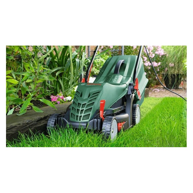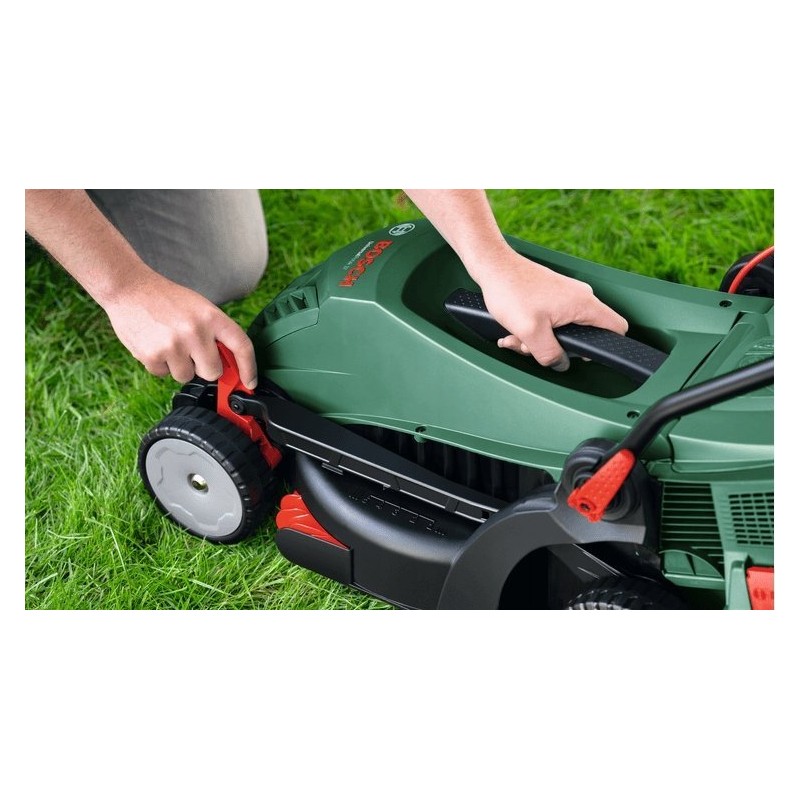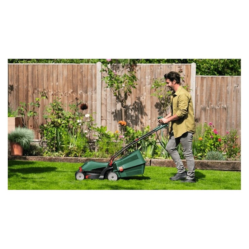 Der 1400-W-Motor sorgt für Zuverlässigkeit und Effizienz, selbst unter schwierigen Bedingungen wie steilen Hängen oder unebenem Gelände. Der Rasenmäher bietet eine fünfstufige Schnitthöhenverstellung von 25 bis 70 mm, wodurch die Schnitthöhe an die individuellen Bedürfnisse angepasst werden kann. Das Fassungsvermögen des Grasfangkorbs beträgt 40 Liter, was die Häufigkeit des Entleerens verringert und wertvolle Zeit spart.