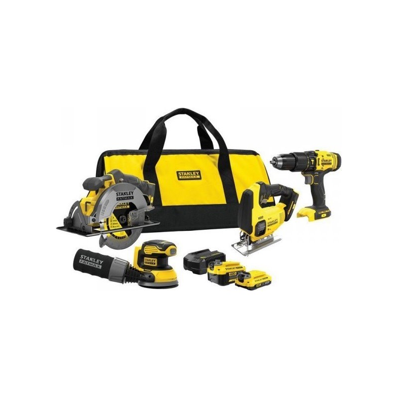 Das Stanley Fatmax SFMCK412MDS Elektrowerkzeugset ist ein Akku-Werkzeugset, das einen Bohrschrauber, einen Exzenterschleifer, eine Kreissäge, eine Stichsäge, zwei Akkus, ein Ladegerät und eine Transporttasche enthält.