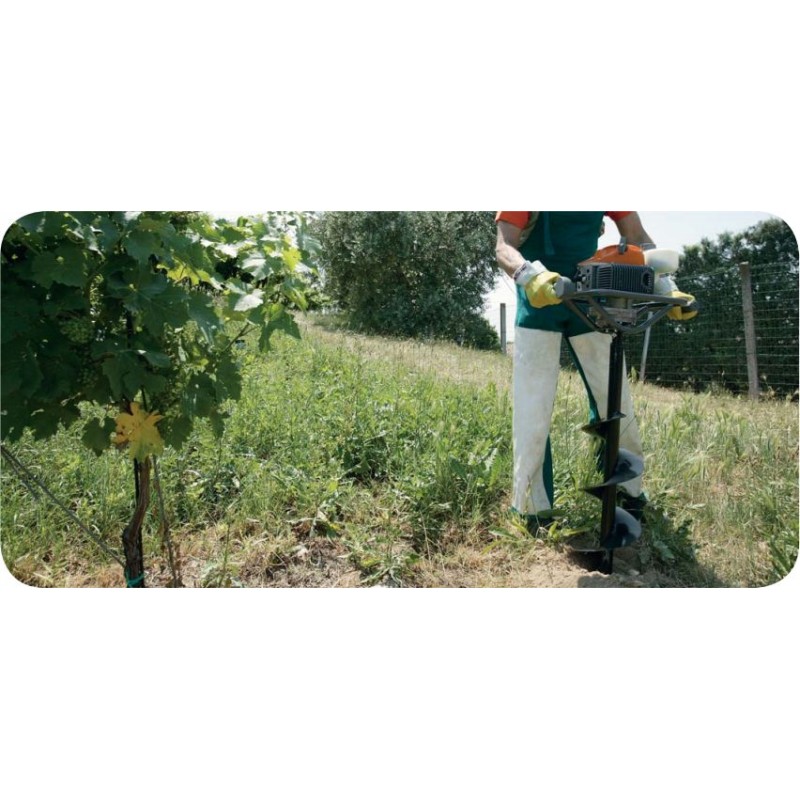 - Das Modell wurde für kleinere Bohrungen im Boden für verschiedene Anwendungen (Weinberge und Pflanzen, Straßenbeleuchtung, Zaunhalterungen) entwickelt und ist mit einem Emak-Zweitaktmotor, einem verchromten Zylinder sowie einer Motorwelle und einer Pleuelstange aus geschmiedetem Stahl ausgestattet.