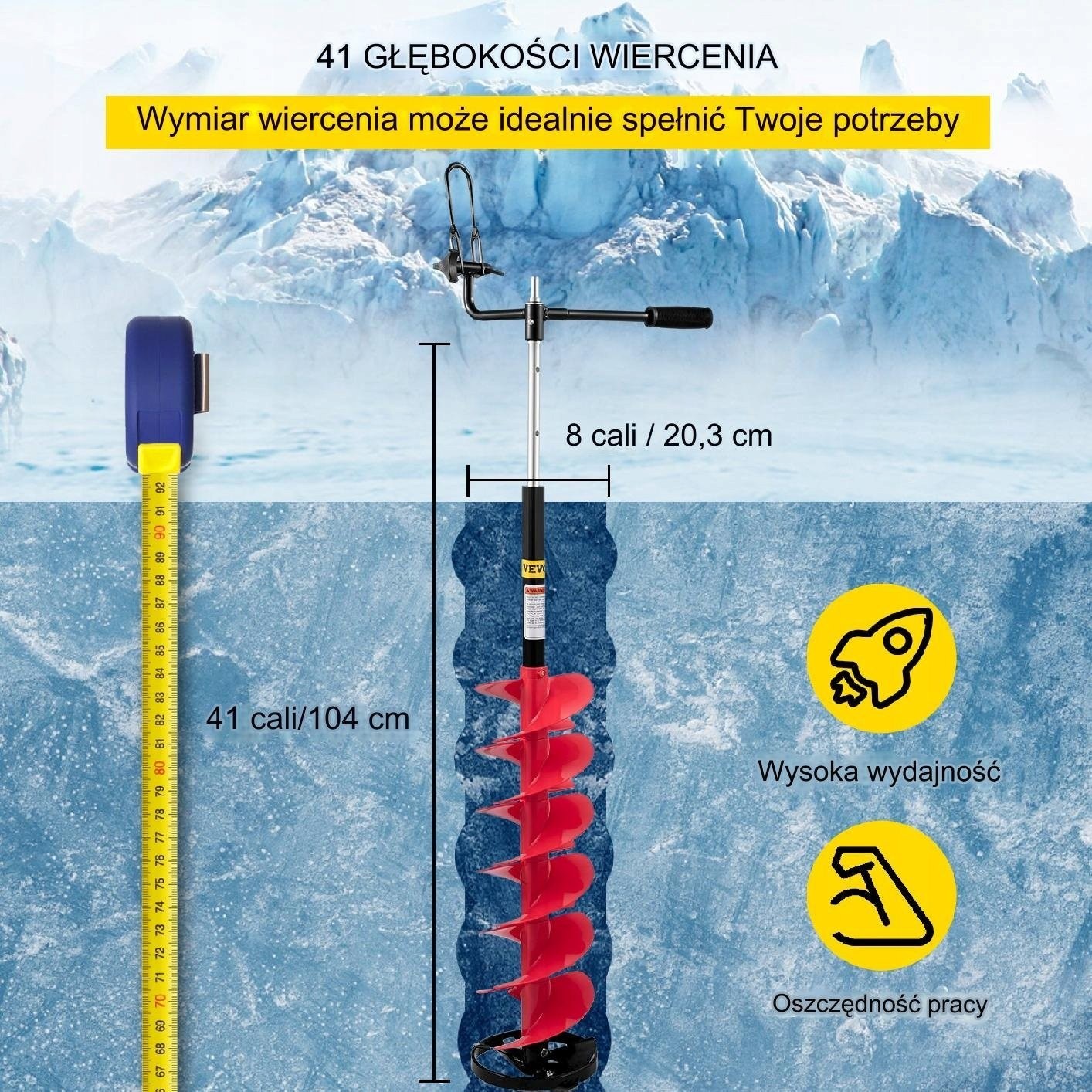 Die effektive Länge des Eisbohrers beträgt 104 cm (ohne Verlängerungsstange), der Drehdurchmesser 20 cm, Gewicht: 5,05 kg. Er ist die ideale Wahl für das Eisfischen, wissenschaftliche Forschung usw.