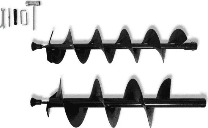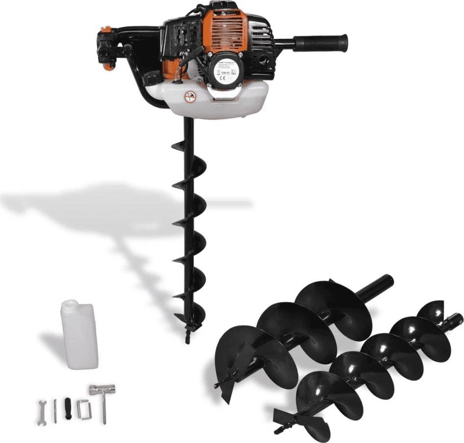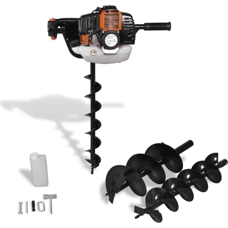Der Benzinbohrer wird mit 3 Erdbohrern, 1 Flasche für das Kraftstoffgemisch, 1 Bohrerbefestigungsset und 1 Werkzeugset geliefert. Die mitgelieferten Bohrer haben unterschiedliche Durchmesser, sodass Sie den für die jeweilige Arbeit am besten geeigneten auswählen können.