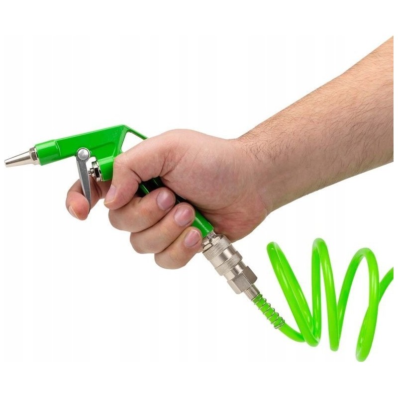 Der Schlauch zeichnet sich durch sein geringes Gewicht und dicht angeordnete Windungen aus. Der mit Schnellkupplungen ausgestattete Schlauch dient zur Verlängerung von Druckluftschläuchen und zum schnellen Anschließen von Druckluftgeräten