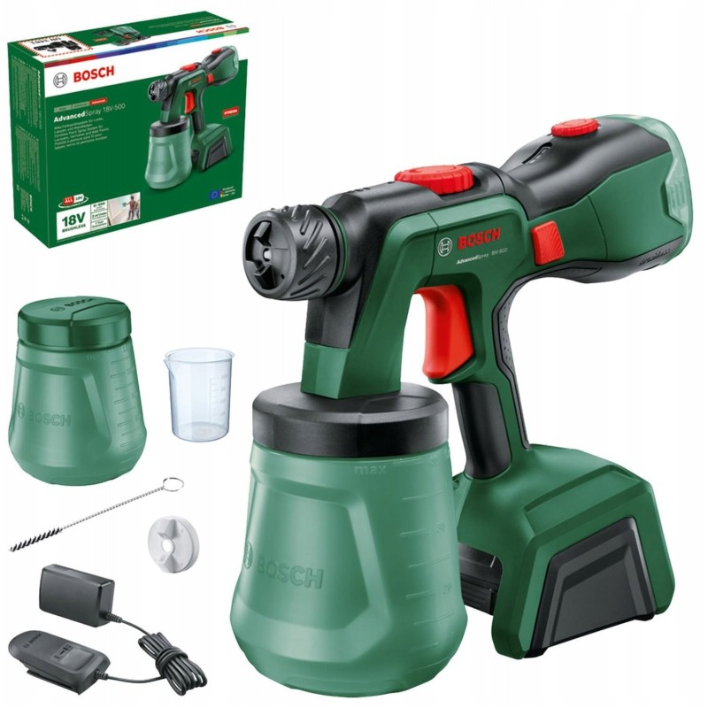 Im Standardlieferumfang der AdvancedSpray 18V-500 sind alle Teile enthalten, die Sie zum Starten der Lackierarbeiten benötigen: Spritzpistole, Bürste, Messbecher, Feinluftdüse, zusätzlicher Farbbehälter und Ladegerät. Dank dieser Komplettlösung sind Sie sofort nach dem Kauf einsatzbereit.