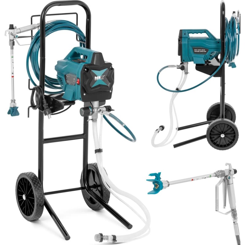 Dadurch eignet sich das hydrodynamische Gerät sowohl für Heimwerkerprojekte als auch für professionelle Dienstleistungen und Malerarbeiten. Dank des Rahmens mit großen Rädern lässt sich das Gerät leicht an den gewünschten Ort transportieren. Der wartungsfreie, bürstenlose 650-W-Motor arbeitet effizient mit einer Drehzahl von bis zu 1300 U/min und verteilt maximal 1,4 Liter Farbe pro Minute in Form eines feinen Nebels.