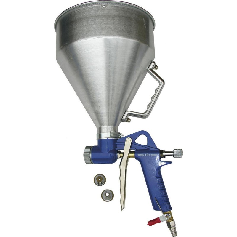 Hopper-Pistolen für Putz und dickflüssige Massen dienen zum Auftragen von dünnflüssigem Spritzputz, Strukturfarben, Barnak usw. Sie sind für die Beschichtung von Fassaden und Wänden mit Materialien vorgesehen, die für Lackierpistolen zu dickflüssig oder zu körnig sind. Dank austauschbarer Düsen kann der Durchmesser an das jeweilige Material angepasst werden.