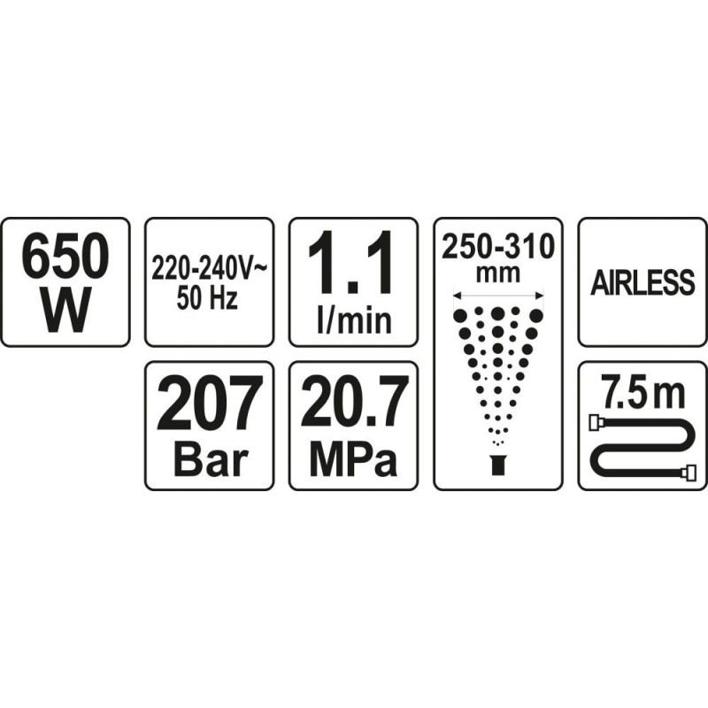 Hydrodynamisches Farbspritzgerät mit einer Leistung von 650 W und einem Druck von 207 bar. Es verfügt über eine Funktion zur Regulierung des Sprühstrahls im Bereich von 250–310 mm. Das Gerät ist mit einem 7,5 Meter langen Schlauch ausgestattet, wodurch es einen großen Arbeitsbereich abdeckt, was den Arbeitskomfort deutlich verbessert. Das Gerät verfügt über eine Pumpe, die Farbe aus jedem beliebigen Behälter ansaugt. Es ist für das Streichen großer Wand- und Deckenflächen vorgesehen. Geeignet für Latex-, Acryl-, Dispersions- und Lackfarben usw.