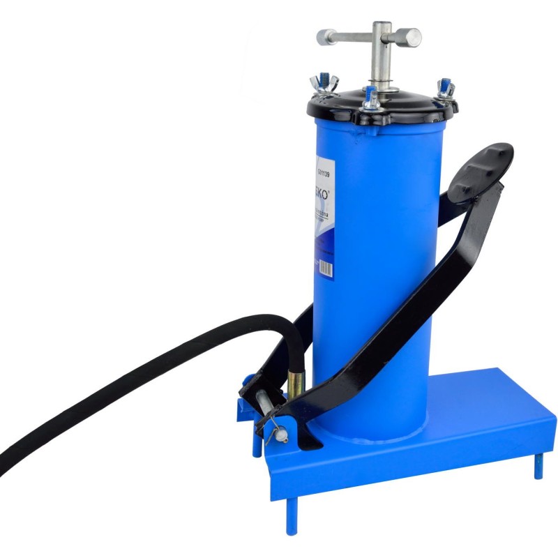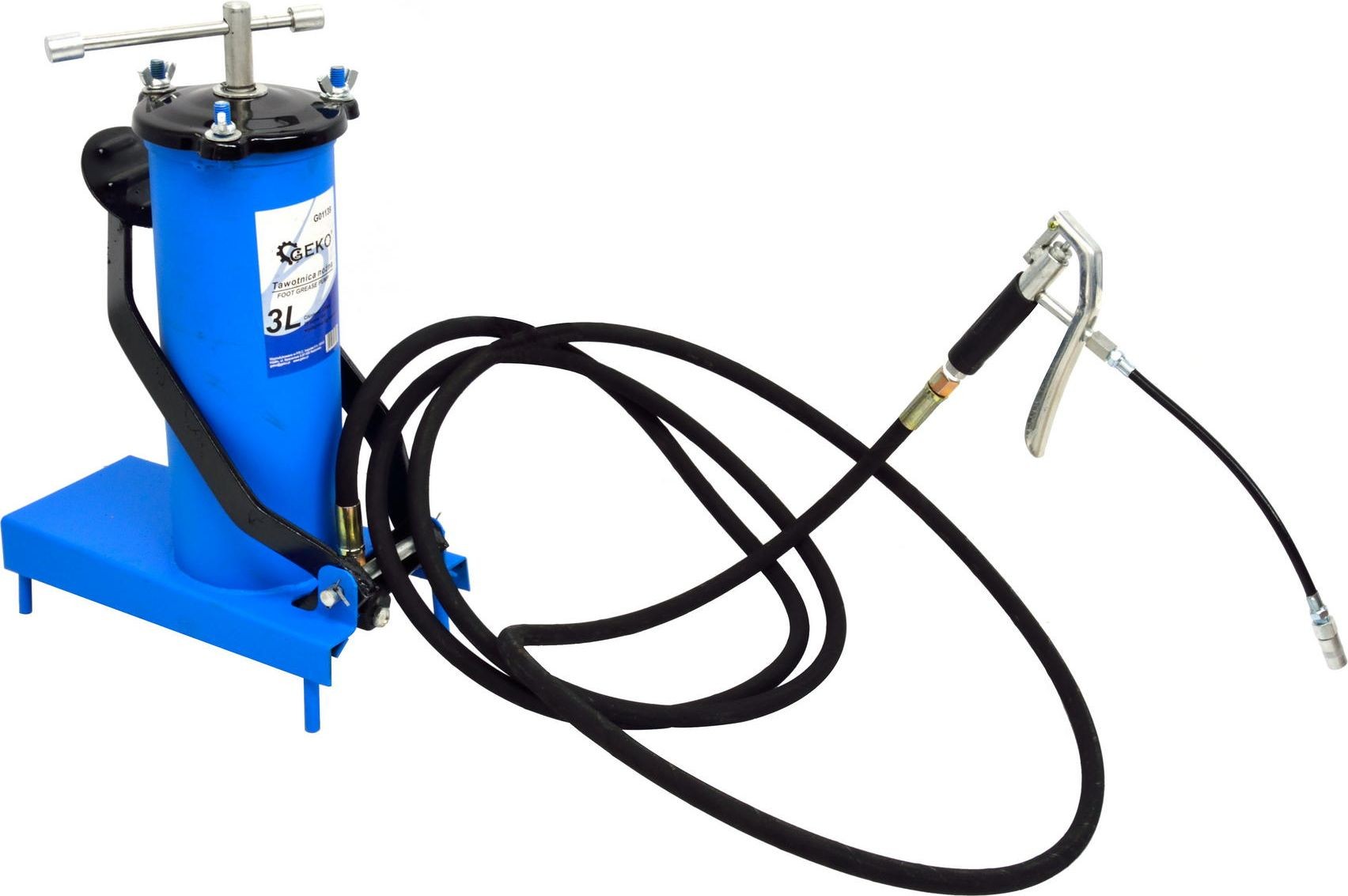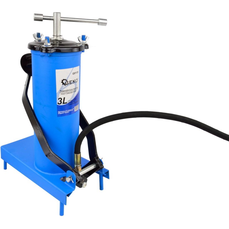 Fußschmiervorrichtung mit 3-Liter-Behälter und 4 m langem Schlauch Fußschmiervorrichtung mit einem Fassungsvermögen von 3 Litern und einem 4 Meter langen Schlauch. Die Fettpresse eignet sich ideal für Werkstattarbeiten, bei denen hohe Präzision gefragt ist, u. a. zum Schmieren von Maschinen und Geräten mit einem Schmiersystem in Form von Schmiernippeln. Der 4 Meter lange Schlauch der Fettpresse verfügt über eine Pistole mit einem montierten flexiblen Schlauch und einer Standarddüse, auf die die meisten Schmiernippel passen. Produktmerkmale: präzise Schmierung, maximaler Betriebsdruck 30 MPa, Fassungsvermögen 3 Liter, robuste und dichte Konstruktion, Standardaufsatz passend für die meisten Schmiernippel, 4 m langer Schlauch, ca. 22 cm langer flexibler Schlauch, Schmiergerät mit Fußbetätigung