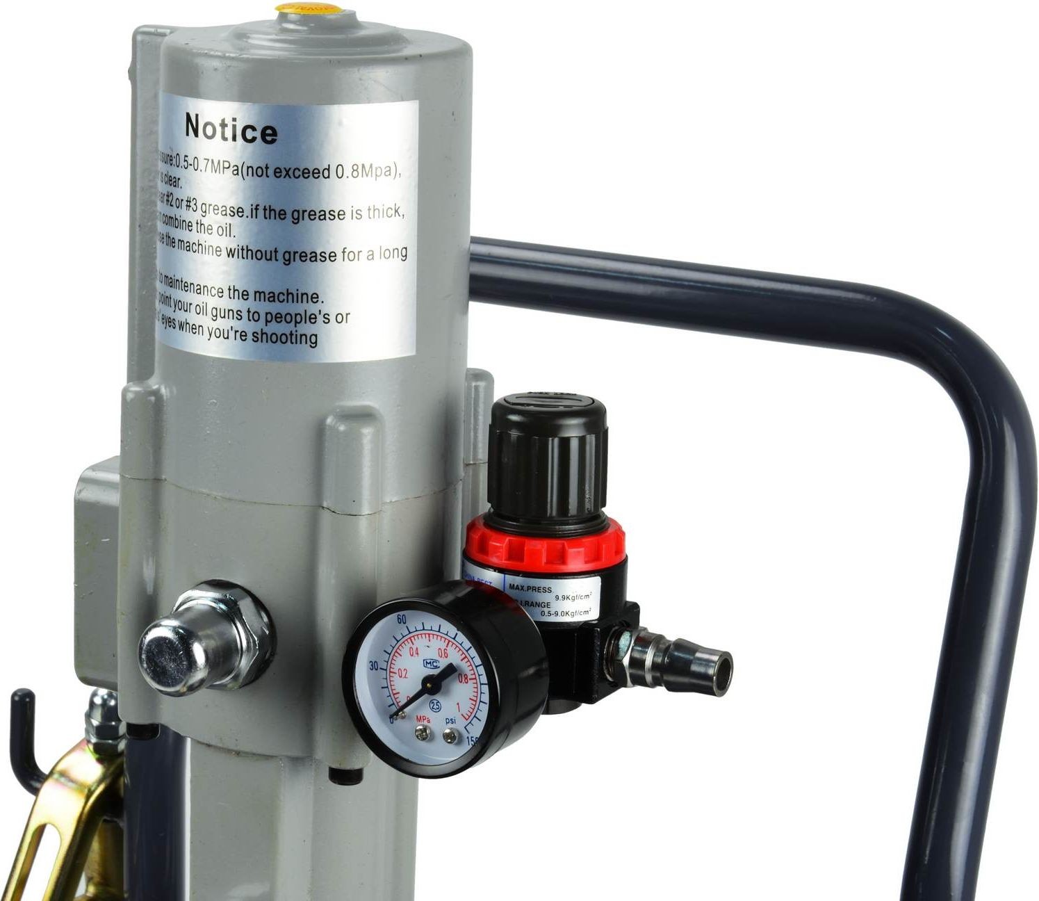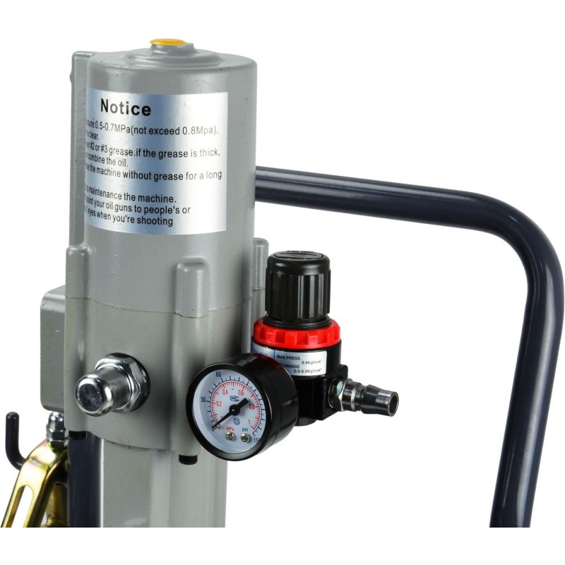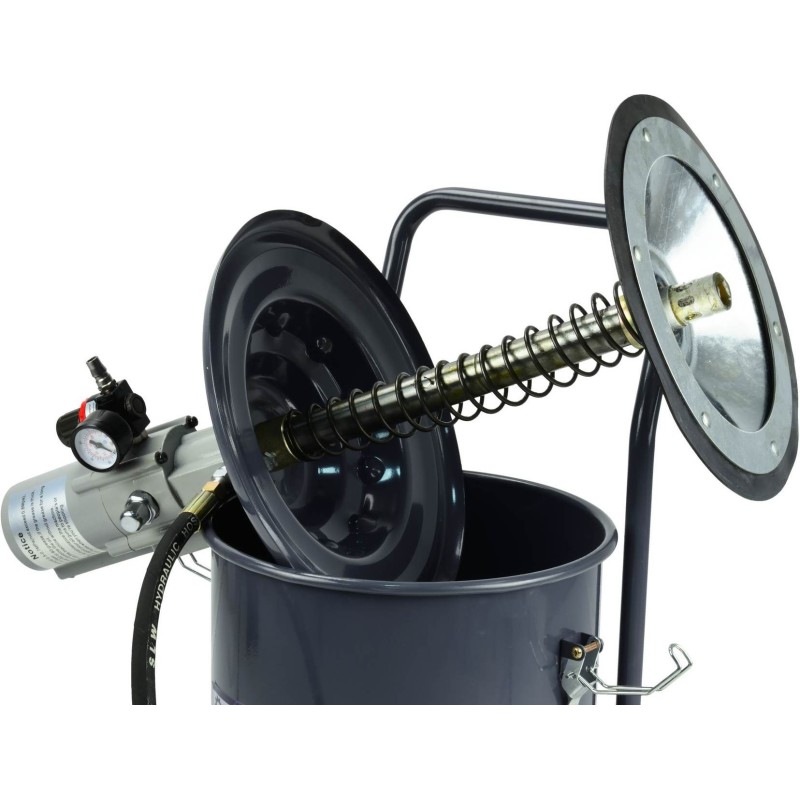 Stationäre pneumatische Fettpresse 20 l Pneumatische Fettpresse zum Pumpen von Schmierfetten unter hohem Druck. Im Lieferumfang enthalten sind eine Fettpumpe, ein 4 m langer Fettschlauch und eine drehbare Fettpistole.