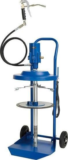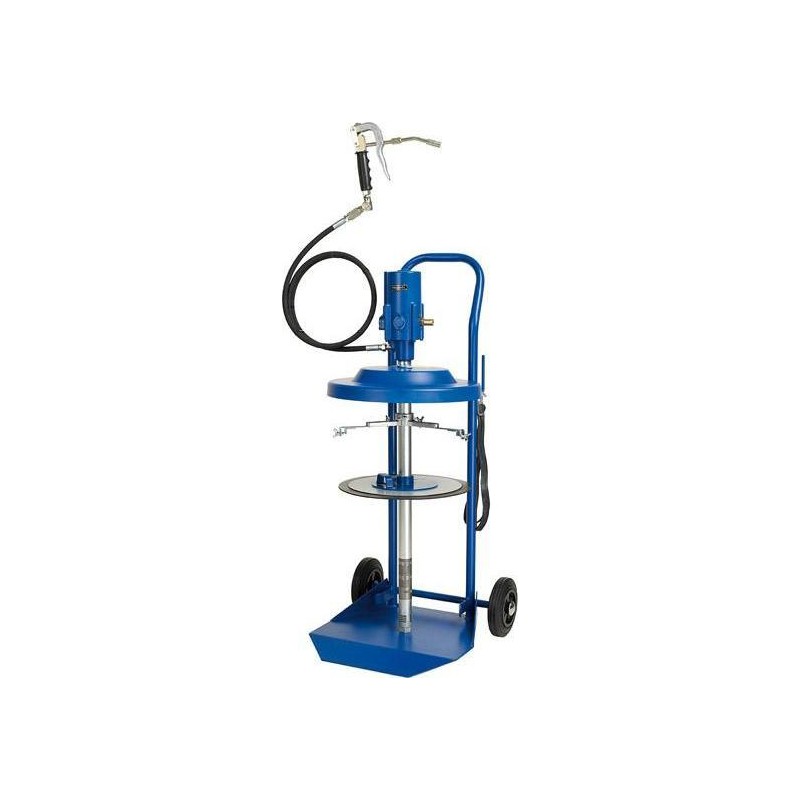 Pneumatisches Schmiergerät-SetAusführung: Mobil, mit Rollwagen, mit Druckluftmotor und Pumpe, mit abnehmbarer Schmierpistole, Nachlaufkolben und 2 m langem Hochdruckschlauch. Schmierpistole mit Düsenrohr und 4-Backen-Schmierspitze sowie Drehgelenk mit Kugellager. Das Druckübersetzungsverhältnis beträgt 50:1. Druckluftanschluss mit Stecknippel für Rectus-Kupplung Typ 26, NW 7,2 mm. Förderleistung 1100 g/min, Behälterentleerung 99 %. Anwendung: Für Kompressoren mit 80 l/min und weitere Anwendungen bei einem empfohlenen Luftdruck von 8 bar....