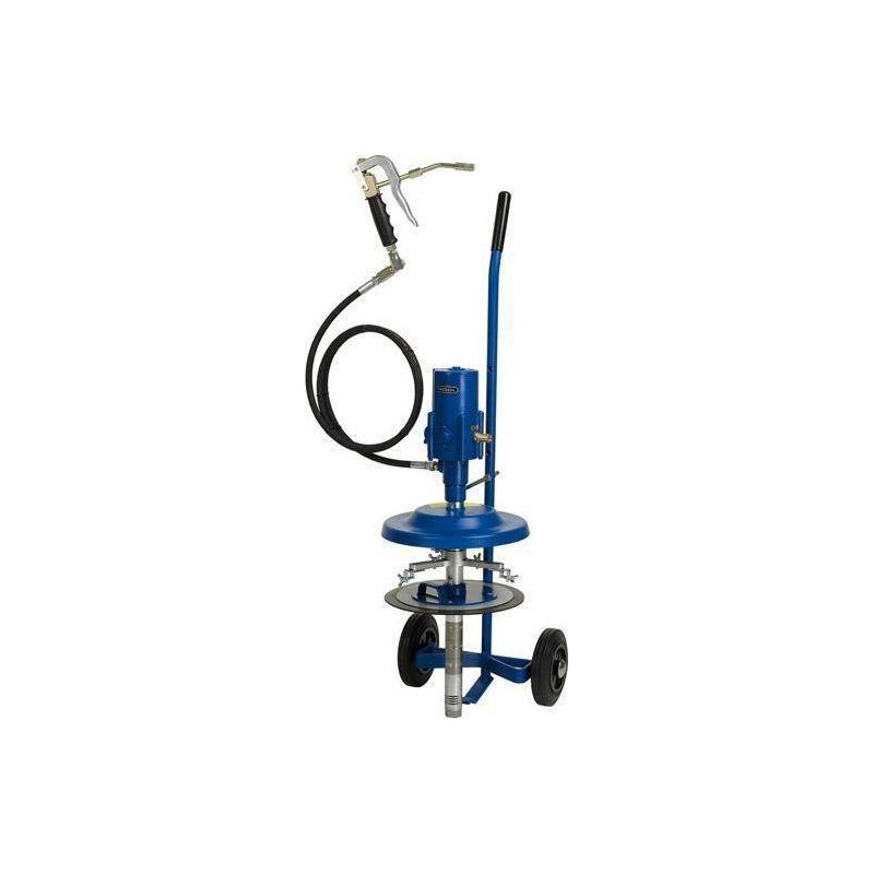 Pneumatisches Schmiergerät-SetAusführung: Mobil, mit Rollwagen, mit Druckluftmotor und Pumpe, mit abnehmbarer Schmierpistole, Nachlaufkolben und 2 m langem Hochdruckschlauch. Schmierpistole mit Düsenrohr und 4-Backen-Schmierspitze sowie Drehgelenk mit Kugellager. Das Druckübersetzungsverhältnis beträgt 50:1. Druckluftanschluss mit Stecknippel für Rectus-Kupplung Typ 26, NW 7,2 mm. Förderleistung 1100 g/min, Behälterentleerung 99 %. Anwendung: Für Kompressoren mit 80 l/min und weitere Anwendungen bei einem empfohlenen Luftdruck von 8 bar....