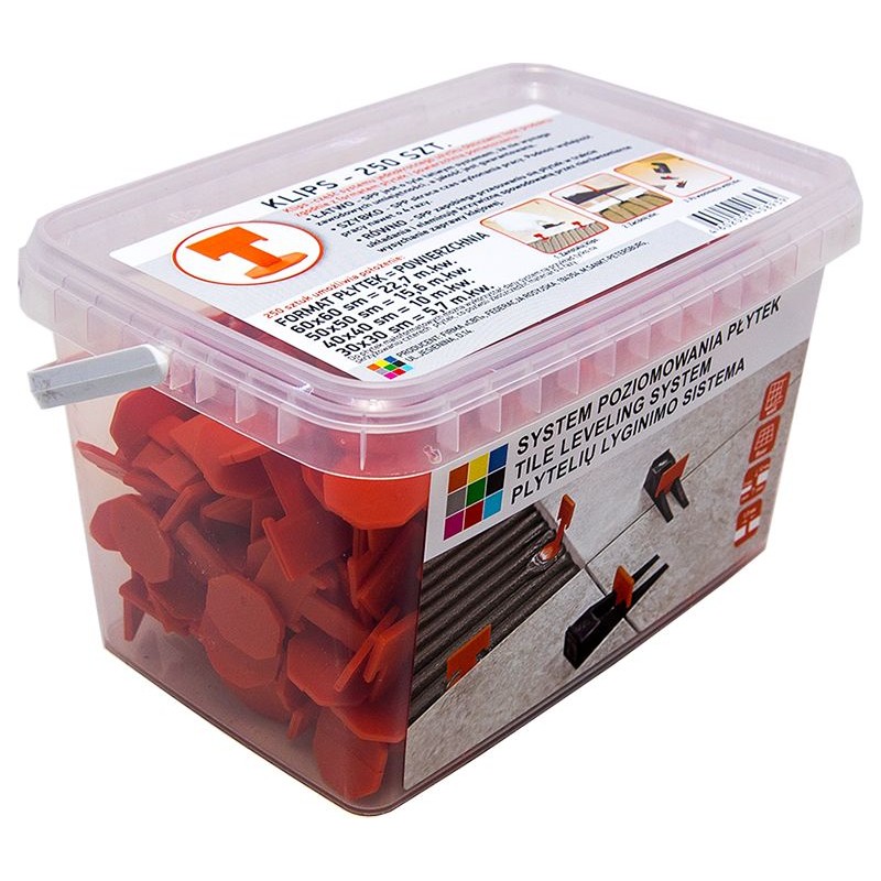KLIPS – Teil des Einwegsystems. Wir berechnen die benötigte Produktmenge entsprechend dem Fliesenformat und der Raumfläche. 500 Stück reichen für folgende Verlegeflächen: 60 x 60 cm = 62 m²; 50 x 50 cm = 62 m²; 40 x 40 cm = 40 m²; 30 x 30 cm = 23 m². Für eine genaue Berechnung empfehlen wir die Verwendung des RECHNER