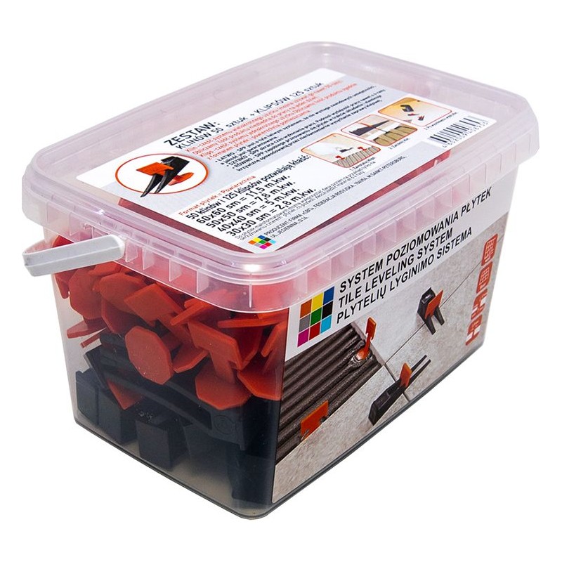 KEIL – Teil des Mehrwegsystems. Er kann bis zu 50 Mal verwendet werden! Wir berechnen die Produktmenge, die für einen Arbeitstag benötigt wird. CLIP – Teil des Einwegsystems. Wir berechnen die Produktmenge entsprechend der Fliesengröße und der Raumfläche. Mit 100 Keilen und 750 Clips lassen sich verlegen: 60 x 60 cm = 62,5 m²; 50 x 50 cm = 46,5 m²; 40 x 40 cm = 26,7 m²; 30 x 30 cm = 15,6 m². Für eine genaue Berechnung wird die Verwendung des RECHNERs empfohlen