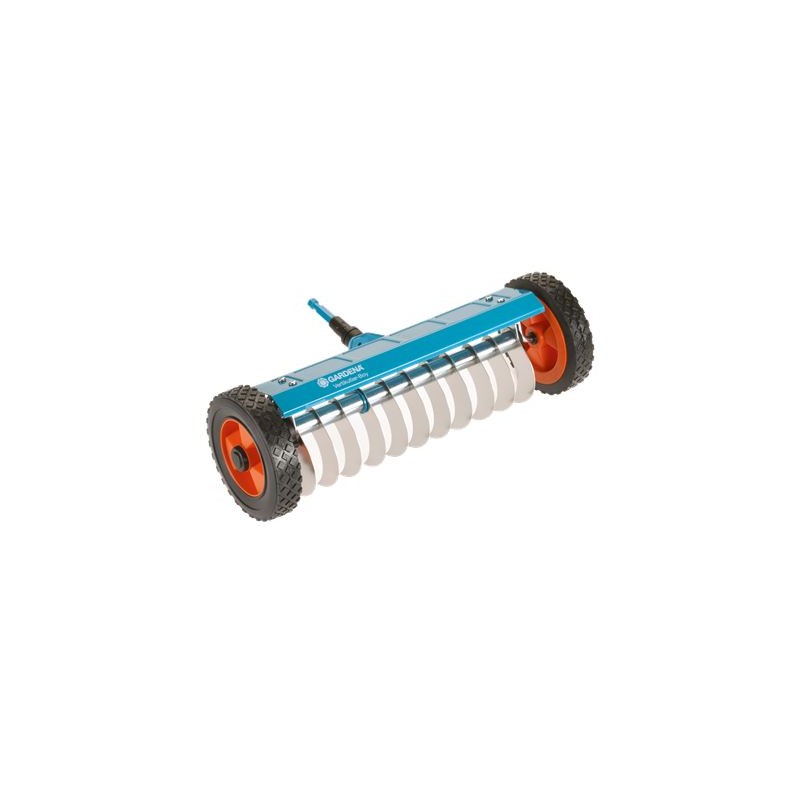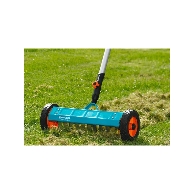 GARDENA combisystem – Der Vertikutierer auf Rädern ermöglicht das Entfernen von Moos, Rasenfilz und Unkraut aus dem Rasen. Dies verbessert die Aufnahme von Luft, Wasser und Nährstoffen durch den Rasen. Spezielle Zinken aus hochwertigem rostfreiem Stahl dringen in den Rasen ein und entfernen unerwünschten Rasenfilz sowie abgestorbenes Gras. Die Arbeitsbreite beträgt 32 cm. Robuste Räder mit Spezialprofil und eine hochklappbare Achse erleichtern die Arbeit. Passend für alle GARDENA combisystem-Stiele. Empfohlene Stiellänge: 180 cm. Garantiezeit: 25 Jahre.