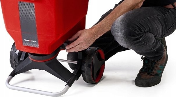 Dank der großen Räder lässt sich der Akku-Streuer leicht führen und das Saatgut gleichmäßig verteilen.