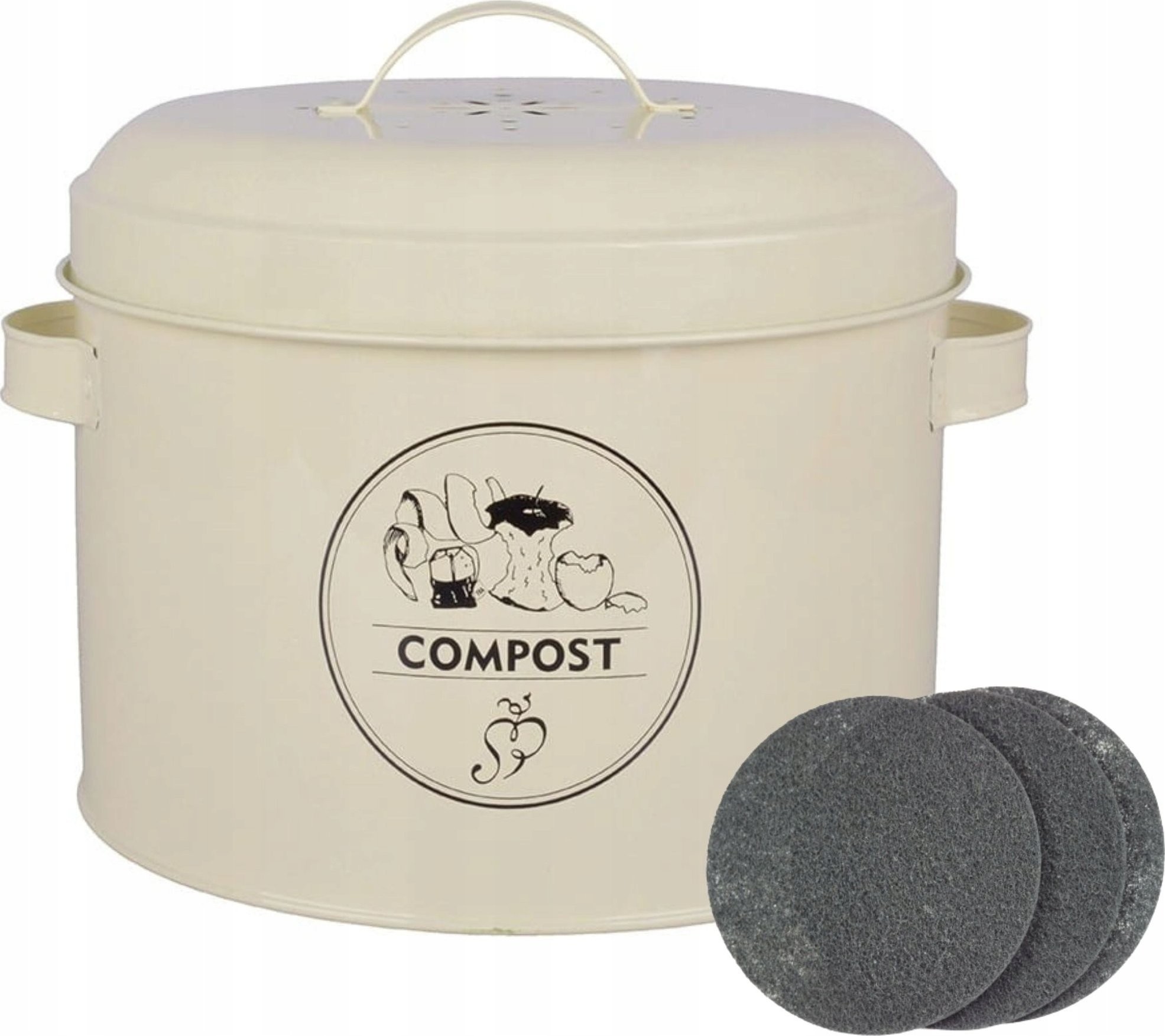 Die Aktivkohlefilter sind für den Küchenkomposter der niederländischen Firma Esschert Design geeignet. Der Komposter ist sehr solide aus Metall gefertigt, die Innenseite ist glatt, sodass er leicht zu reinigen ist. Im Deckel befindet sich: